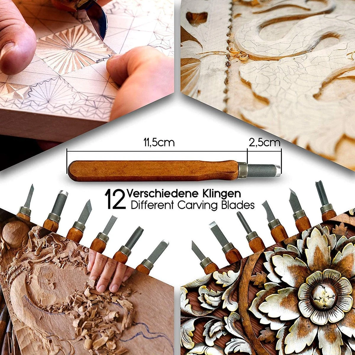 - 12 messen: elke houtsnijmachine professional weet hoe belangrijk de passende messen zijn. En elke beginner merkt snel dat hij niet met een snijset hout kan bewerken, waarbij het mes ontbreekt. Daarom zijn er 12 optimale mesvormen