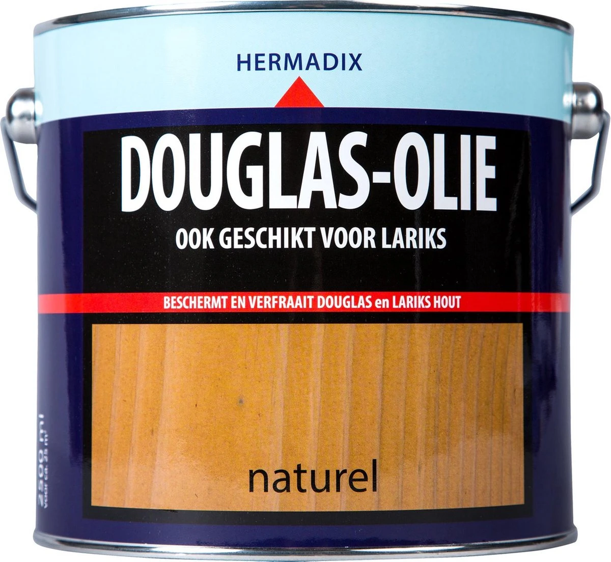 Hermadix Douglas / Lariks olie is speciaal ontwikkeld voor nieuw en oud douglas / lariks hout. Douglas / Lariks olie geeft een transparante uitstraling zodat de houtnerf en houtstructuur zichtbaar blijven. Douglas / Lariks olie dringt diep in het hout en geeft een matte, natuurlijke uitstraling. Douglas / Lariks olie droogt snel en is makkelijk verwerkbaar. 1-2 lagen douglas / lariks olie zijn voldoende voor een prachtig resultaat. Bij onderhoudslagen lichtjes tussendoor schuren. Douglas / lariks olie is een watergedragen, mens- en milieuvriendelijk olie op basis van natuurlijke ingrediënten.