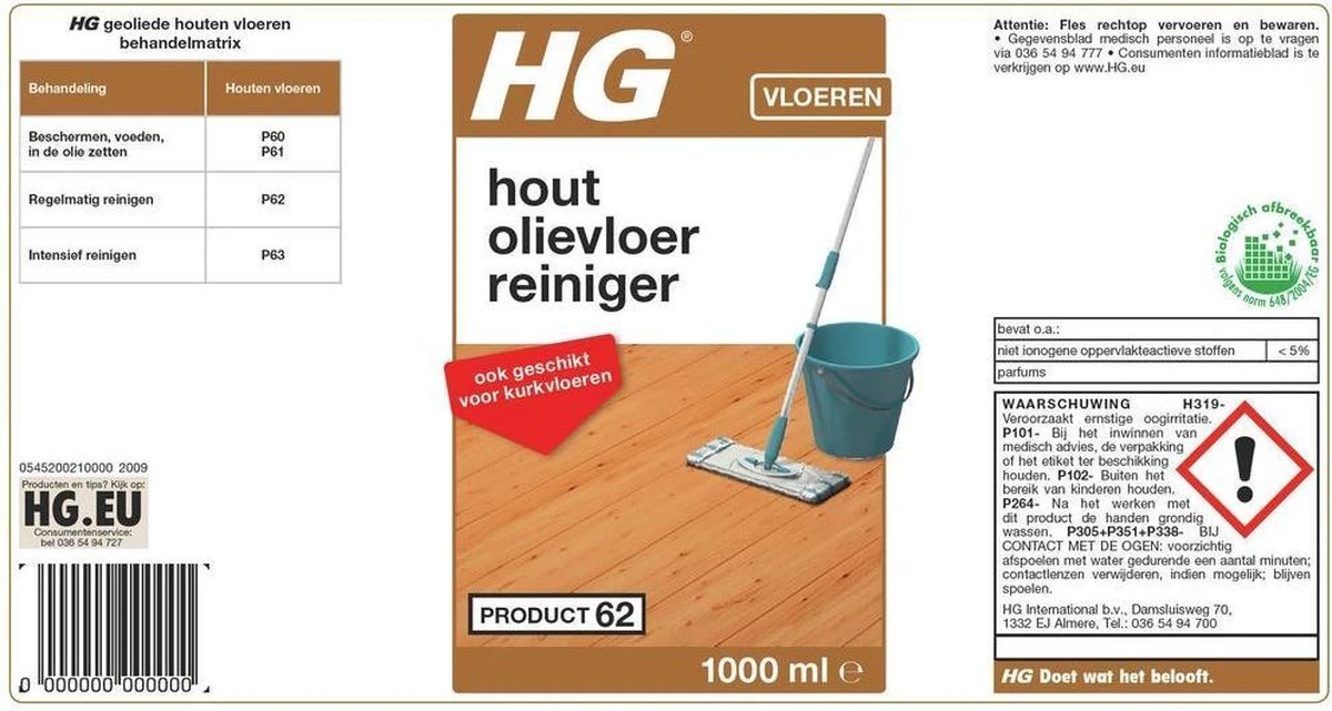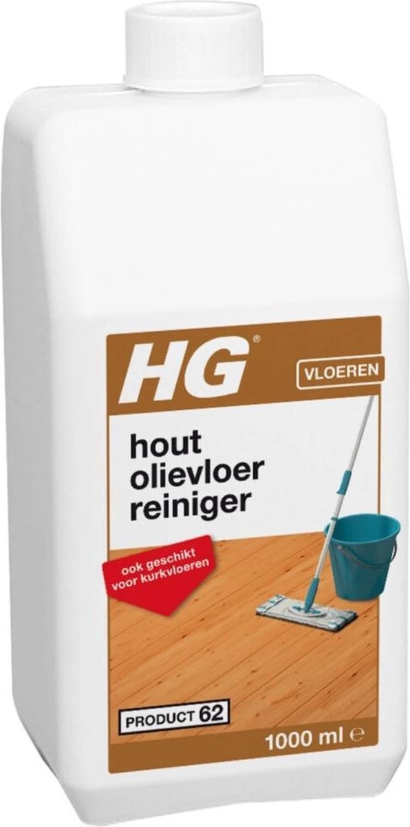 HG hout olievloerreiniger is een unieke dweilreiniger, speciaal voor het regelmatig en toch veilig reinigen van met olie behandelde of onbehandelde houten vloeren. HG hout olievloerreiniger is een heerlijk fris ruikende en geconcentreerde dweilreiniger en tast de olie en het hout niet aan. Het is zelfs geschikt voor het reinigen van kurkvloeren. 1 liter is goed voor wel 20 dweilbeurten.