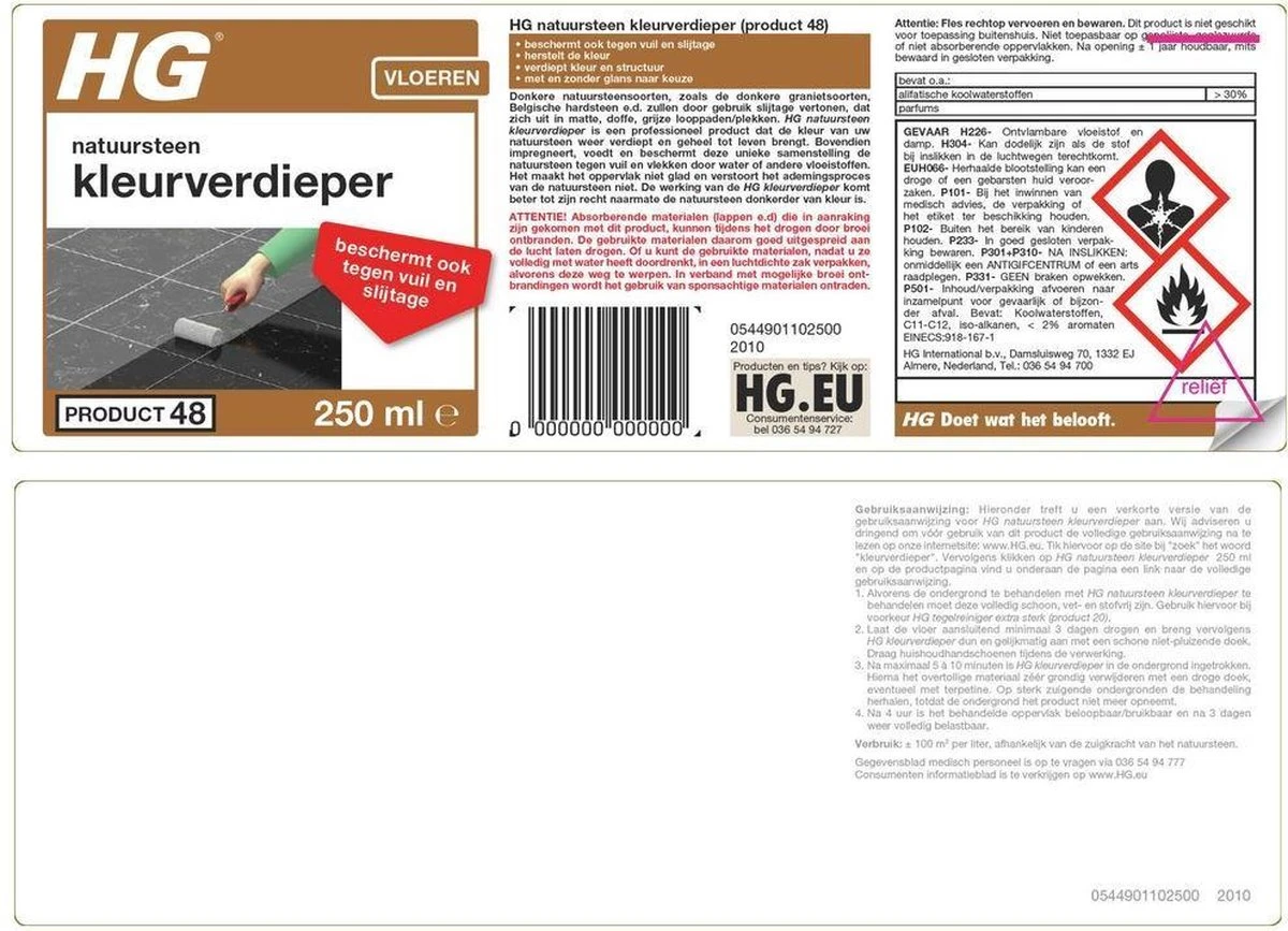 HG natuursteen kleurverdieper is een professioneel product dat de kleur van natuursteen weer verdiept en geheel tot leven brengt. Geschikt voor donkere natuursteensoorten. Donkere natuursteensoorten, zoals donker graniet, Belgisch hardsteen en blauwe steen gaan slijtage vertonen door gebruik. Dit uit zich in matte, doffe, grijze plekken. HG natuursteen kleurverdieper impregneert, voedt en beschermt het natuursteen tegen vuil en vlekken door water of andere vloeistoffen.
