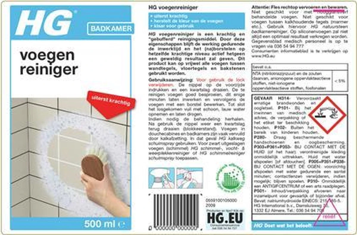 HG voegenreiniger verwijdert sterke vervuiling van vrijwel alle voegen tussen wandtegels, vloertegels en bakstenen en herstelt zo in een handomdraai de originele kleur. HG voegenreiniger heeft een gebufferde werking, waardoor het tijdens het inwerken en borstelen krachtig blijft werken voor een perfect resultaat. Ideaal voor in de badkamer, toilet of keuken om verkleurde voegen weer als nieuw te krijgen.