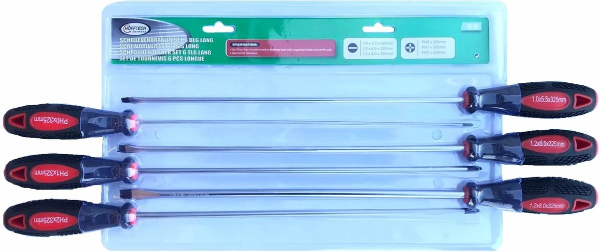 - Platkop schroevendraaiers: 1.0 × 5.5 × 325 mm, 1.2 × 6.5 × 325 mm, 1.2 × 8.0 × 325 mm.