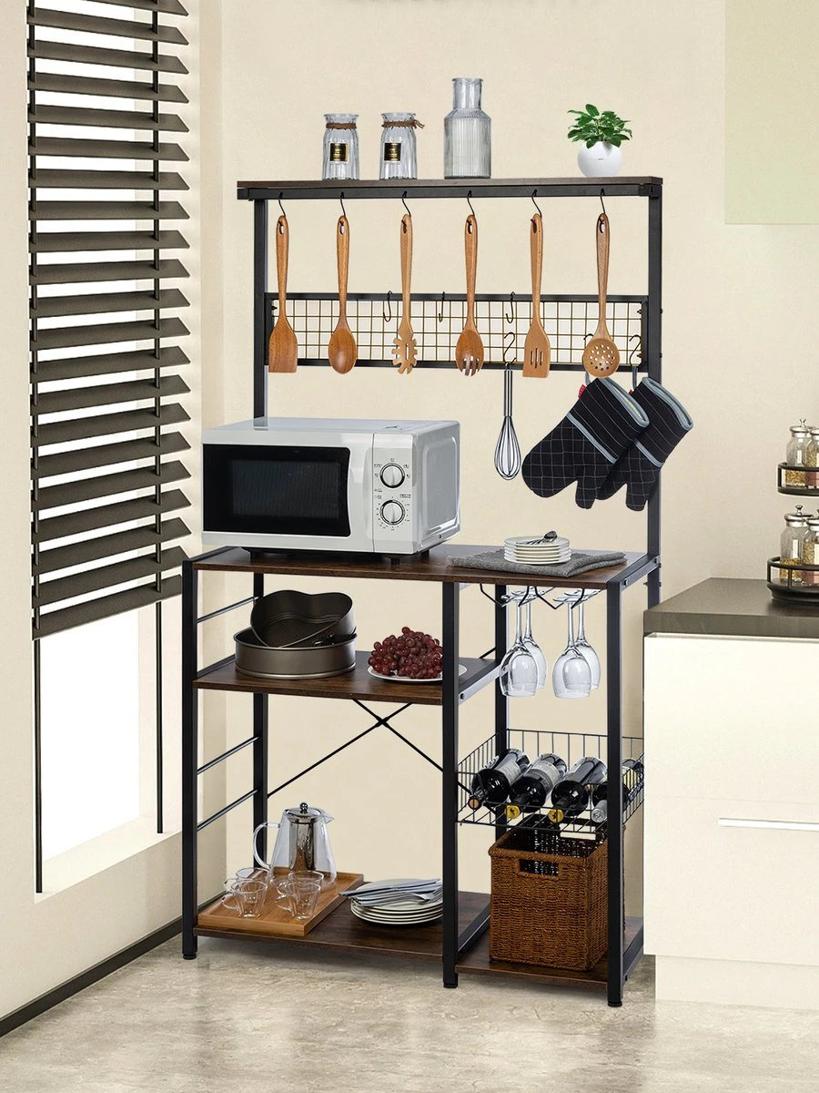 Het keukenrek is ontworpen met ingebouwde gaten en gaaspanelen boven het aanrecht, zodat u S-vormige haken kunt gebruiken om keukengerei of pannenlappen op te hangen en zo de opbergruimte kunt uitbreiden. De onderpoten kunnen worden aangepast als ze wankel zijn en de gaasmand kan worden losgemaakt voor grotere opslagruimte onder het aanrecht.
