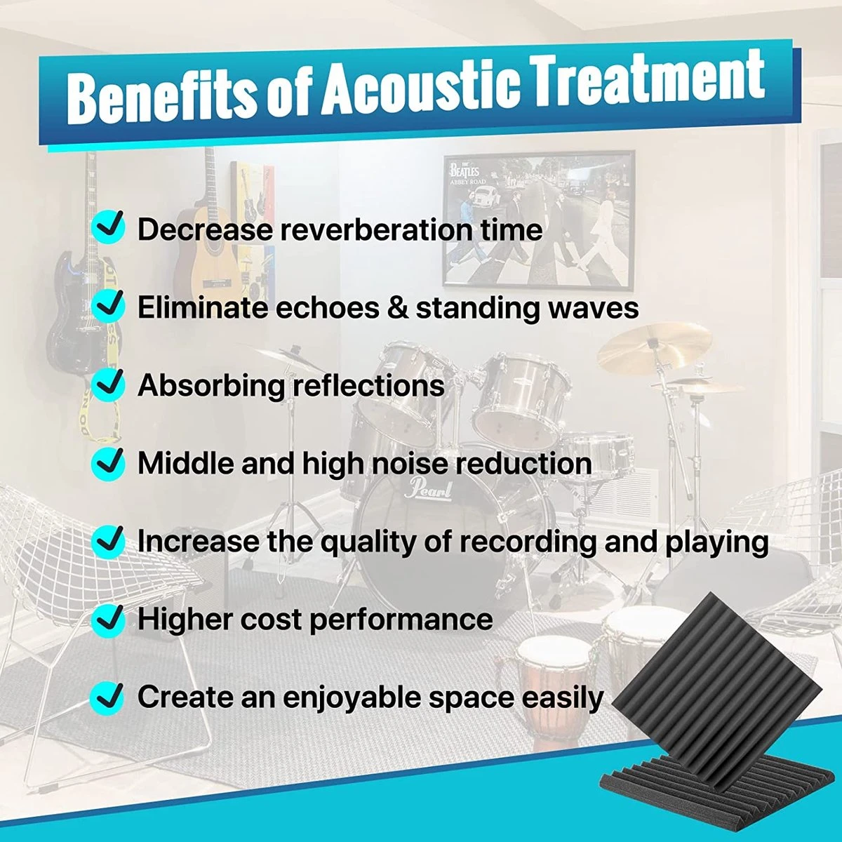 Het akoestische schuim kan de trillingen en weerkaatsing van interieurgeluiden verminderen, zodat het geluid een beter afspeel- en opname-effect heeft. Zeer geschikt voor thuisstudio’s, thuisbioscopen, woontextiel, muziekkamers, speelkamers en kantoren.