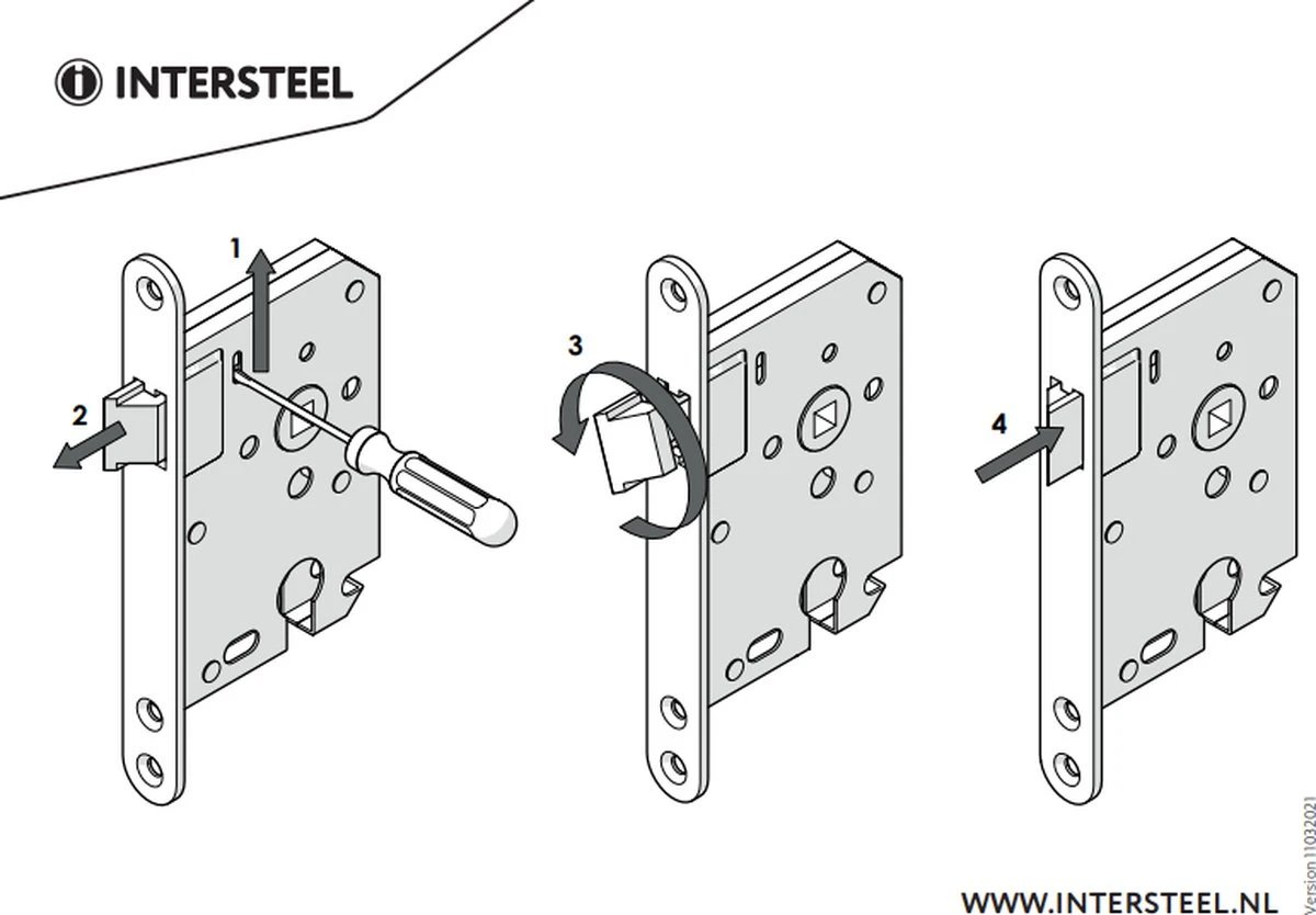 Dit slot wordt geleverd in toilet-/badkamer uitvoering op 63 mm met 8mm stift. De sloten van Intersteel en de bijbehorende sluitplaten zijn verkrijgbaar in diverse uitvoeringen en draairichtingen. De doornmaat van het slot is 50 mm en wordt geleverd inclusief sluitplaat en voorplaat. De witte voorplaat heeft een afmeting van 174 x 20 mm (hxb). U kunt dezelfde inbouw- en freesmaten gebruiken als een standaard woningslot. De dagschoot van dit slot is omwisselbaar; dat wil zeggen dat deze voor zowel een linksdraaiende deur als een rechtsdraaiende deur geschikt is.