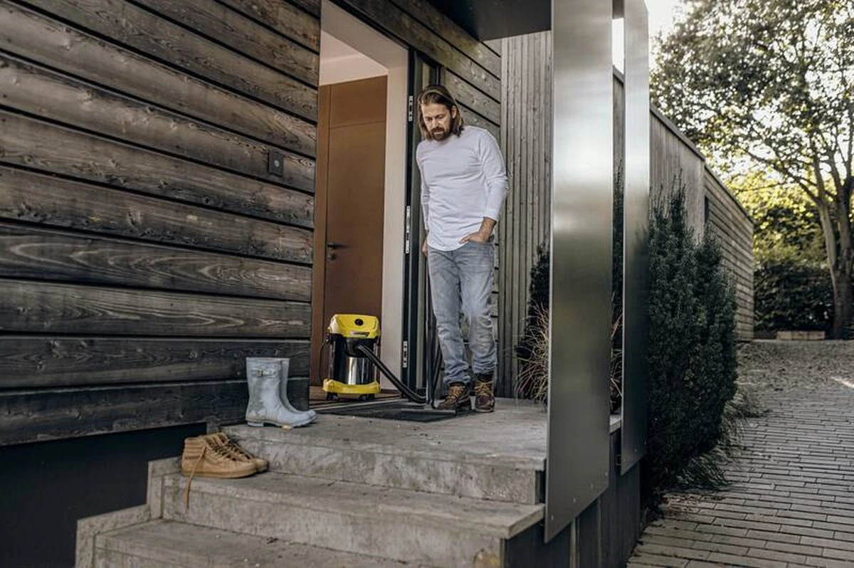 De WD 3 S V-17/4/20 is krachtig en energiezuinig met een stroomverbruik van slechts 1000 W. Zowel het apparaat als de zuigslang en het Clips-vloermondstuk zijn perfect op elkaar afgestemd – voor de beste reinigingsresultaten op droog, nat, fijn of grof vuil. De nat- en droogzuiger overtuigt door zijn compacte ontwerp en een robuuste roestvrijstalen container van 17 l, 4 m stroomkabel, 2 m zuigslang en zijn vliesfilterzak. Dankzij het patroonfilter uit één stuk is het mogelijk om zowel nat als droog vuil op te zuigen zonder filtervervanging. De blaasfunctie is handig voor het reinigen van moeilijk bereikbare plaatsen. De slang wordt opgeborgen door deze aan de kop van de machine te hangen, waardoor ruimte wordt bespaard. De kabel kan worden opgeborgen aan de kabelhaak, buizen en vloermondstukken aan de bumper. Het “Pull & Push”-vergrendelingssysteem maakt het eenvoudig openen en sluiten van de container mogelijk. De handgreep van de stofzuiger kan worden verwijderd en het accessoire kan direct op de zuigslang worden aangesloten. Ook slim: gereedschap of kleine onderdelen kunnen op het opbervak op de machinekop neergezet worden. De ergonomisch gevormde draaggreep maakt comfortabel transport mogelijk.