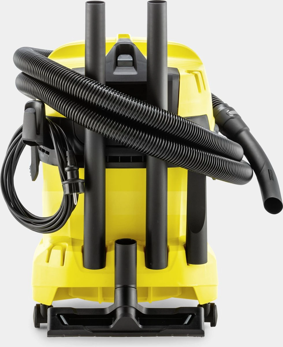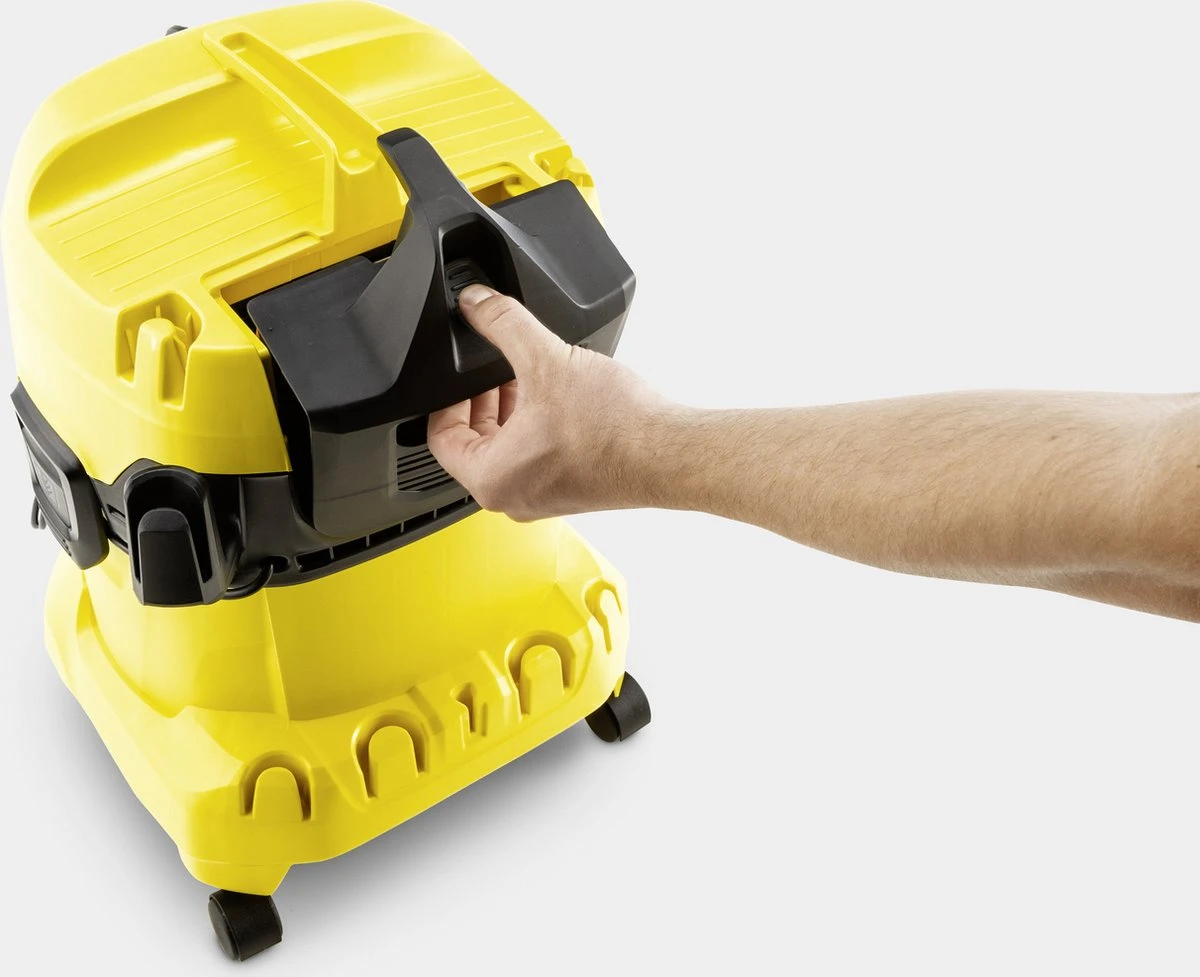 Krachtige zuigkracht en energiezuinige prestaties met een stroomverbruik van slechts 1000 watt. Omdat vloermondstuk, zuigslang en apparaat perfect op elkaar zijn afgestemd, bereik je perfecte reinigingsresultaten en verwijder je zonder onderbrekingen en zonder filtervervanging nat, droog, fijn of grof vuil. De WD 4 V-20/5/22 is uitgerust met een robuuste, slagvaste kunststof bak van 20 liter, een snoer van 5 meter, een zuigslang van 2,2 meter, een vlakfilter en een vliesfilterzak. Dankzij gepatenteerde technologie kan het filter in de nat- en droogzuiger eenvoudig en snel in enkele seconden worden verwijderd – zonder in contact te komen met vuil. Door de afneembare handgreep kunnen accessoires direct aan de zuigslang worden bevestigd. De slang kan compact op de apparaatkop worden opgeborgen. De apparaatkop biedt ook voldoende ruimte om kleine onderdelen op te bergen wanneer dat nodig is. Door de parkeerpositie op de bumper kunnen de buizen en het vloermondstuk ook snel en gemakkelijk worden opgeborgen. Andere voordelen zijn het “Pull & Push”-vergrendelingssysteem voor eenvoudig openen en sluiten van de container, evenals een ergonomisch gevormde draaggreep voor comfortabel transport van het apparaat.