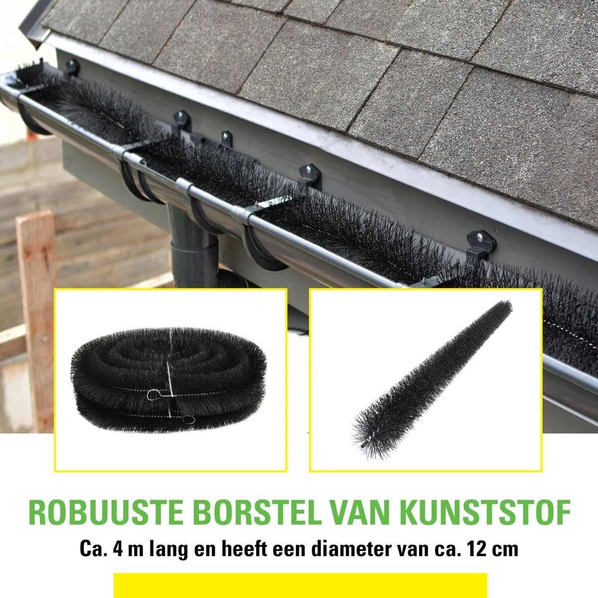 De dakgootbeschermer is 4 meter lang en heeft een doorsnede van 12 centimeter. De borstel heeft kunststof haren en een kern van roestvrij staal. Hij gaat jarenlang mee en je hoeft hem maar ongeveer 1 keer per jaar schoon te maken.