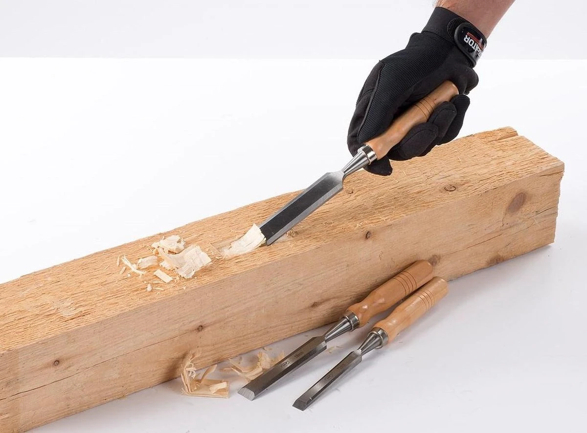 Deze houtbeitelset bevat vier platte houtbeitels uit koolstofstaal en met een houten handvat.