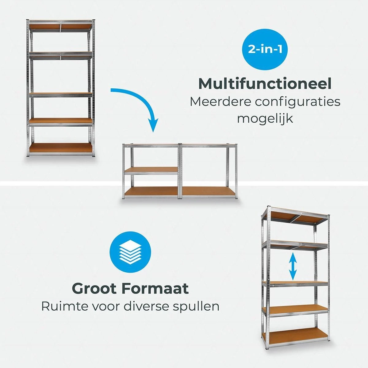 De stellage heeft 5 lange opbergplanken. Iedere plank heeft maar liefst 175 kg draagkracht. In totaal biedt de stellage je ongeveer 1.8 m2 aan opbergruimte. De garage ziet er binnen no-time opgeruimd uit.