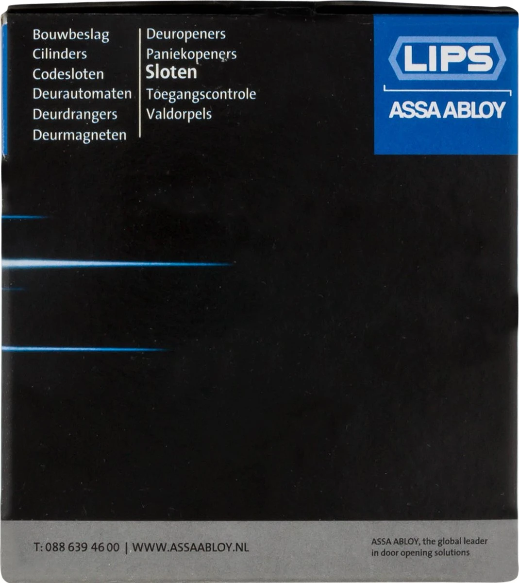 | Verpakkingsinhoud | Lips oplegslot Sluitkom Veiligheidsrozet SKG2 Montageplaat tbv de rozet Schroeven tbv montage rozet Schroeven tbv montage oplegslot Schroeven tbv montage sluitkom Bruine dopjes om de schroeven af te dekken 3 sleutels |