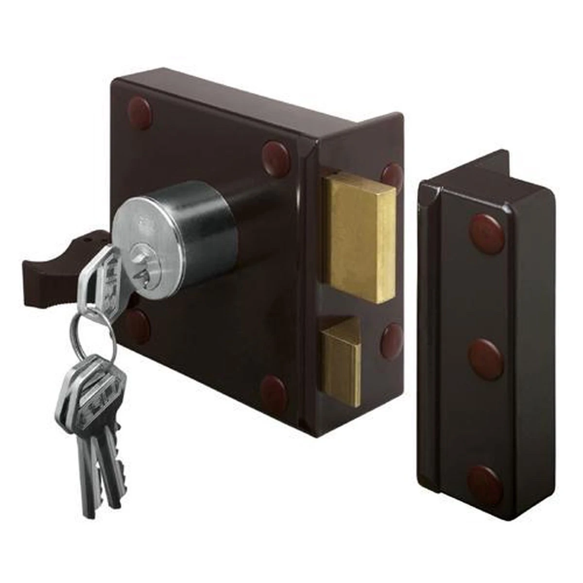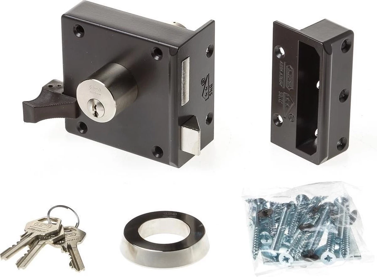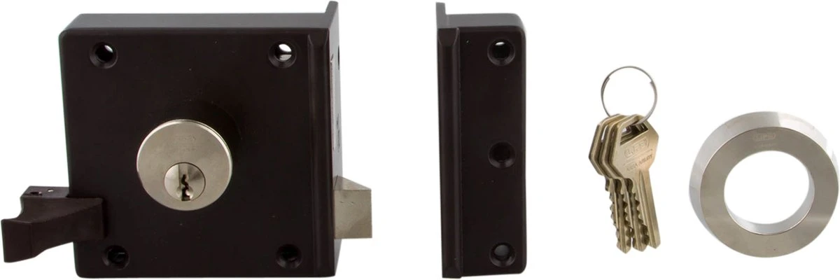 Dag en nacht opleg cilinder slot Lips, 50 mm, vaste cilinder 1753, draairichting 1 binnendraaiend. Veiligheidsslot klasse Zwaar. Kast afmeting 99 x 98 x 18 mm. Met sluitkast 51,5 x 98 mm. Het slot is leverbaar in bruin gelakte uitvoering en heeft een trekknop voor dagschootbediening aan de binnenzijde. De vaste cilinders zijn vernikkeld. Inclusief veiligheidsrozet en 3 sleutels. Dagschoot vast te zetten in ingetrokken toestand.
