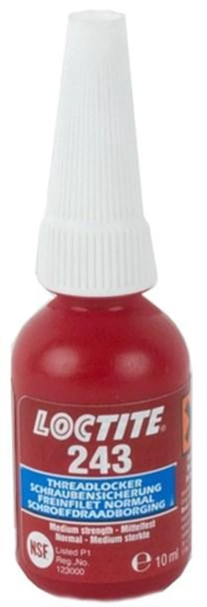 LOCTITE 243 is een schroefdraadborgmiddel met gemiddelde sterkte voor algemeen gebruik. Dit schroefdraadborgmiddel zet bouten, moeren en tapeinden vast en dicht ze af om het loskomen door trilling te voorkomen. Het product is geschikt voor alle metalen, inclusief passieve materialen zoals roestvrij staal, aluminium en oppervlaktebehandelde materialen. Het heeft een bewezen tolerantie voor lichte vervuiling door industriële oliën, zoals motorolie, corrosiewerende olie en snijolie.