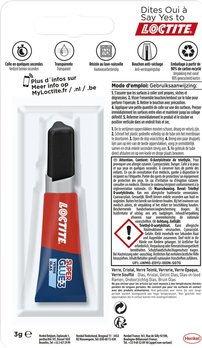 Loctite Super Glue-3 Glass is een supersterke en supersnelle transparante lijm voor glas op glas en glas op metaal. Laat geen sporen na dankzij de transparante formule. Bovendien geschikt voor gekleurd glas, kristal, glas-in-lood ramen en autospiegels. De verlijming is bestand tegen water en zelfs vaatwasserbestendig.