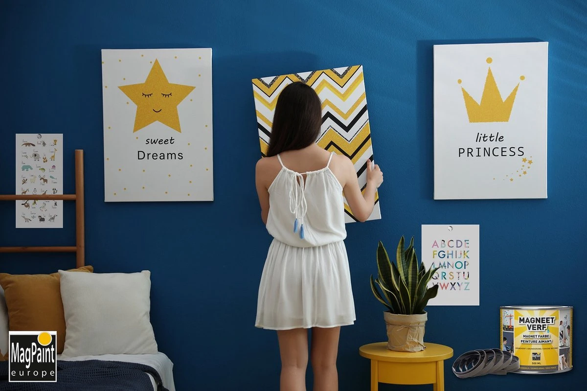 Van een stijlvolle speelwand tot een overzichtelijk planbord voor het hele gezin: gebruik MAGNEETVERF overal in huis om posters, boodschappenlijstjes, theaterkaartjes, tekeningen en foto’s op te hangen. Of schilder magnetische bomen, stripfiguren, kastelen of dieren op de muren. Alles kan!