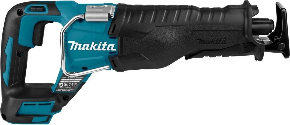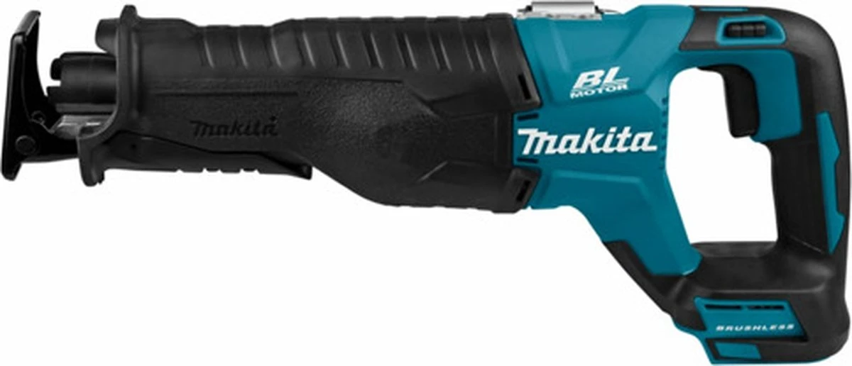 Accu reciprozaag. Sterk staaltje innovatie. Rustig en zuiver zagen met het nieuwe krukasmechanisme, het nieuw ontworpen krukmechanisme minimaliseert de trillingen. Dit is niet alleen prettiger werken, maar zorgt er ook voor dat het zaagblad minder vibreert. Constanter zagen dankzij koolborstelloze motor. Door de vormgeving van het nieuwe krukmechanisme gaat de achterwaartse beweging sneller. Dat komt omdat de achterwaartse hoek kleiner is. Hierdoor zaagt de reciprozaag sneller. De DJR187 biedt een extra voordeel. Doordat dit model is voorzien van een koolborstelloze motor is het toerental veel constanter in vergelijk met de DJR181 en zijn 2-polige motor. Twee elektronische toerentallen. De DJR187 is voorzien van twee instelbare elektronische toerentallen. Het hoge toerental is zeer geschikt voor hout en het lage toerental voor metaal. * Zonder accu”s en lader, en zonder kist * Compacte, energiezuinige en zeer snelle accu reciprozaag. * Zaagt rustig en zuiver dankzij het nieuwe krukmechanisme. * Voorzien van twee instelbare toerentallen afgestemd op hout en metaal. * Extra verstevigde aanslag en met snelklem gemakkelijk te verstellen. * Zaagt sneller dankzij de vormgeving van het nieuwe krukmechanisme. * Makkelijke eenhandszaagwissel: middels kliksysteem en zonder gereedschap. * Beter beschermd tegen het binnendringen van stof en vocht. * Standaard uitgerust met een draaghaak om de machine gemakkelijk aan bijvoorbeeld een steigerbuis op te hangen.Makita DJR187Z 18 V Reciprozaag