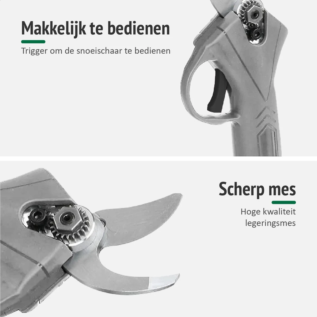 Eenvoudig in gebruik – Deze krachtige elektrische snoeischaar ligt lekker in de hand. de zaag is niet zwaar en heeft een stevige anti-slip grip. Ook al ben je uren aan het snoeien, je zal met deze snoeizaag niet snel moe worden. Ideaal voor iedereen die zijn/haar tuin zelf wil onderhouden, maar daar vaak niet de energie of lichamelijke kracht voor heeft. Deze zaag neemt letterlijk al het zware werk van je over.