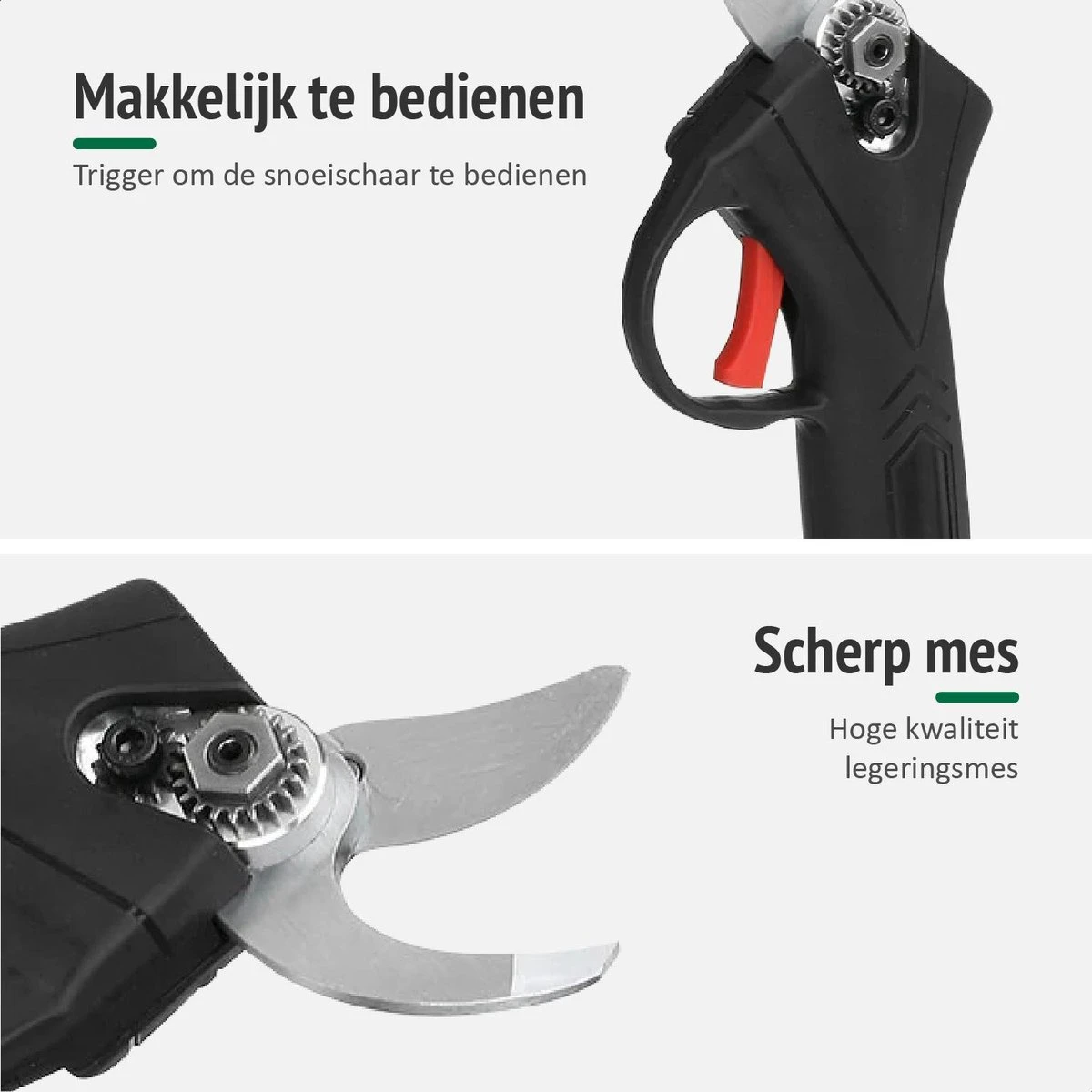 Ook voor professioneel gebruik – De krachtige motor, het hogesnelheids-mechanisme, de anti-slip-grip, het volledige draadloze aspect en de 2 duurzame accu’s zorgen ervoor dat ook voor de professionele hovenier deze unieke snoeischaar uitermate geschikt is.