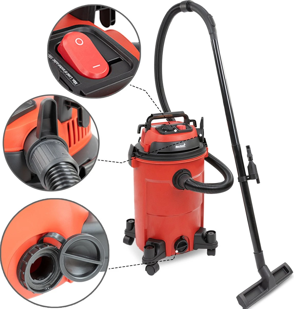 Praktische nat- en droogzuiger met stopcontact en inschakelautomaat voor verschillende schoonmaakklussen