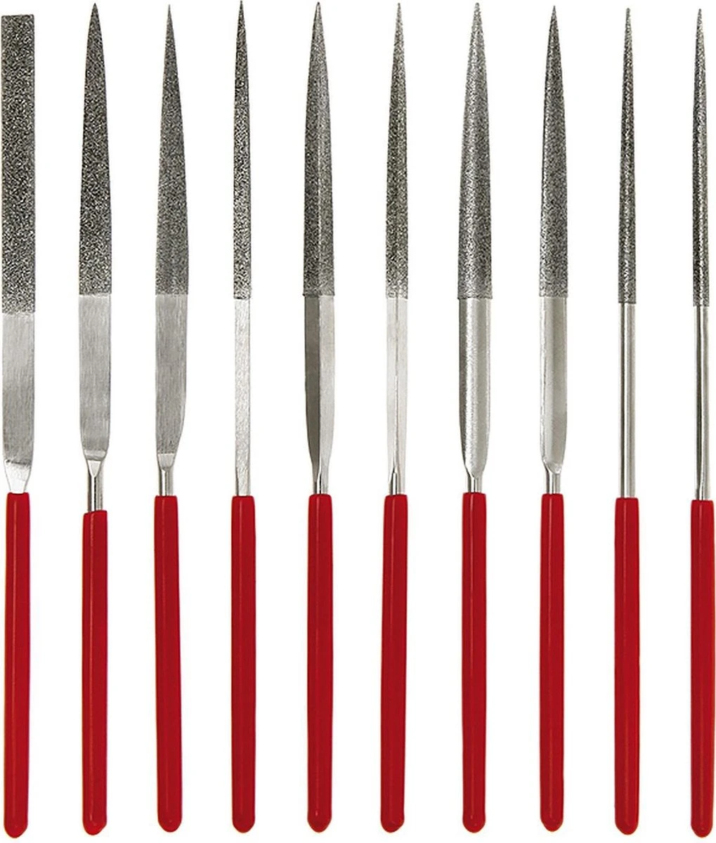 De set bevat een platte parallel, platte conische, ronde, half ronde, mes, driehoek en vierkant vijlen. Voorzien van opbergetui.