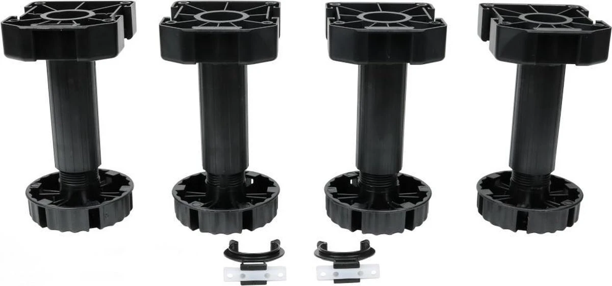 U kunt stelpootjes gebruiken voor het waterpas afstellen van uw (keuken)kasten. Deze set stelpoten bestaat uit vier verstelbare poten die aanpasbaar zijn van 140 mm tot 170 mm. De set wordt geleverd inclusief vier montageblokken en twee plintclips. Alle afmetingen staan weergegeven in bovenstaande afbeeldingen.