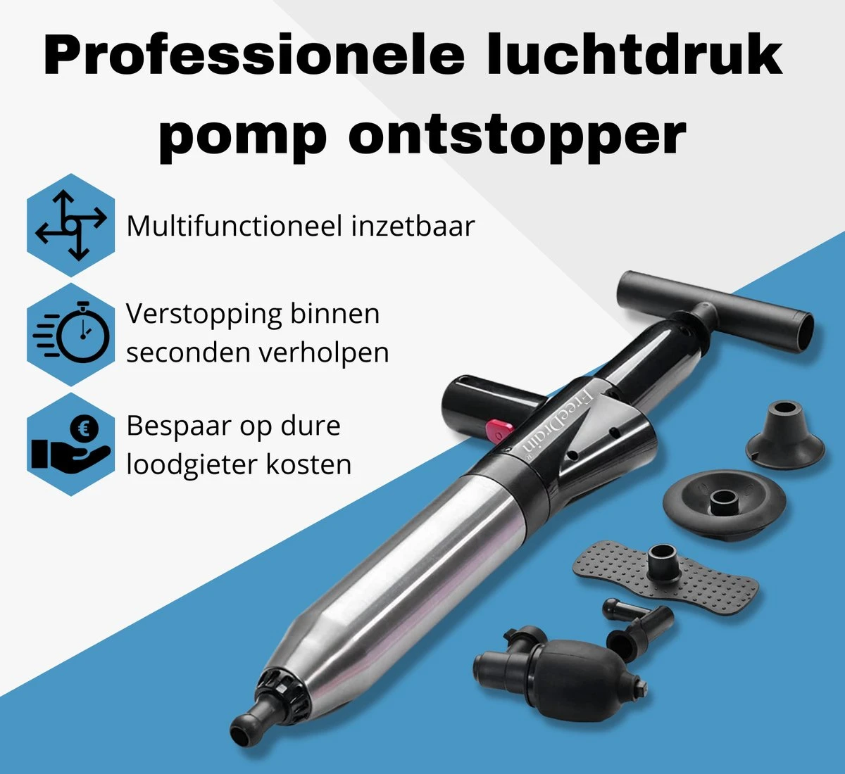 Wil je eindelijk jouw verstopte afvoer weer perfect laten doorstromen, maar lukt dit jou niet met de huis, tuin en keuken middelen? Dan is deze professionele luchtdruk pomp ontstopper van FreeDrain® precies wat jij nodig hebt! Deze krachtpatser is jouw redder in nood omdat met slechts één druk op de knop jouw afvoerleiding weer volledig schoon is. Met als resultaat een perfect doorlopende waterafvoer van jouw toilet, gootsteen, douch of bad. En als extra pluspunt; je bespaart op dure loodgieterskosten!