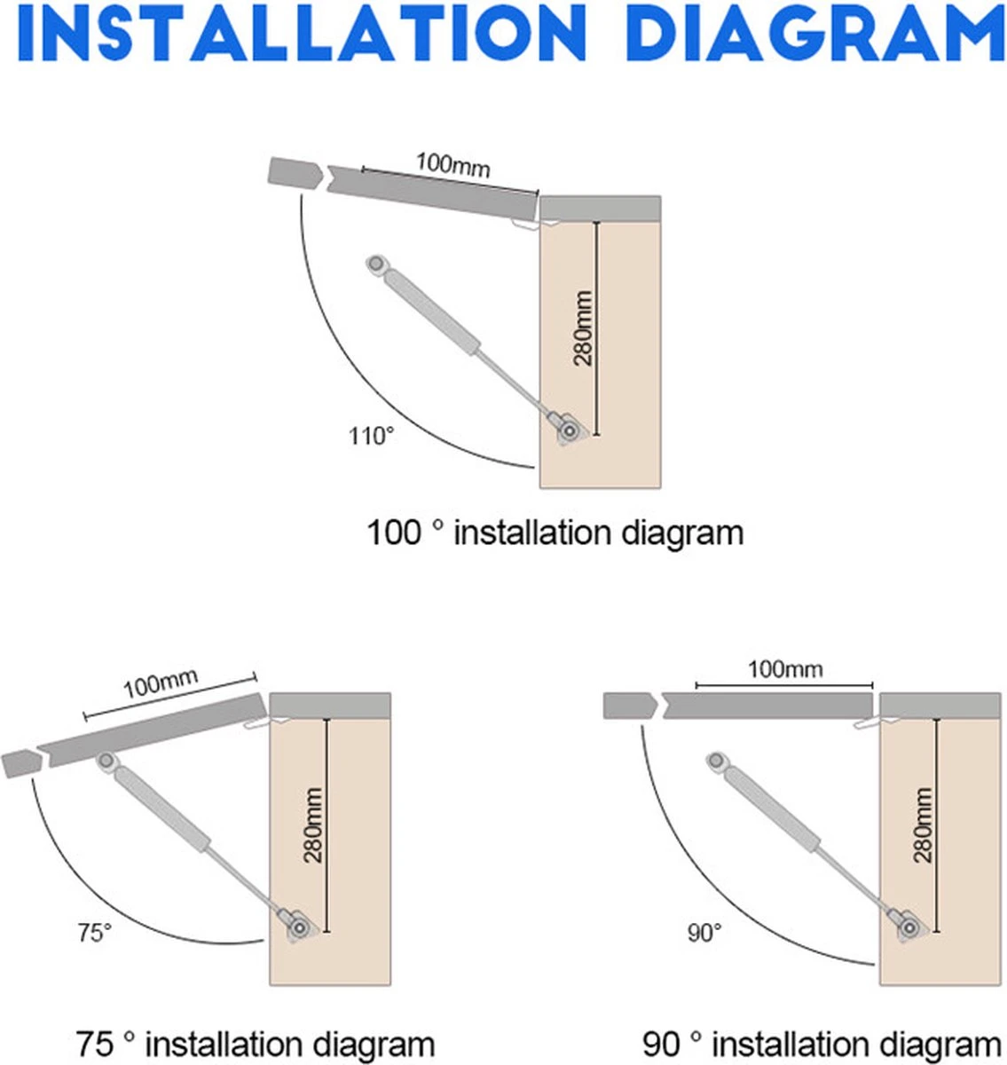 Ook een kleinere of grotere stand is mogelijk, zelfs een hoek van meer dan 90°. De drukveer wordt met een bracket aan de klep gemonteerd. Voor zowel montage van de gaslift aan de zijkant van een holle klep als aan de onderkant van de klep is een bracket meegeleverd. Deze twee brackets, te zien op de laatste afbeelding worden beiden meegeleverd, evenals de ronde bracket voor de binnenkant van de kist of kast.