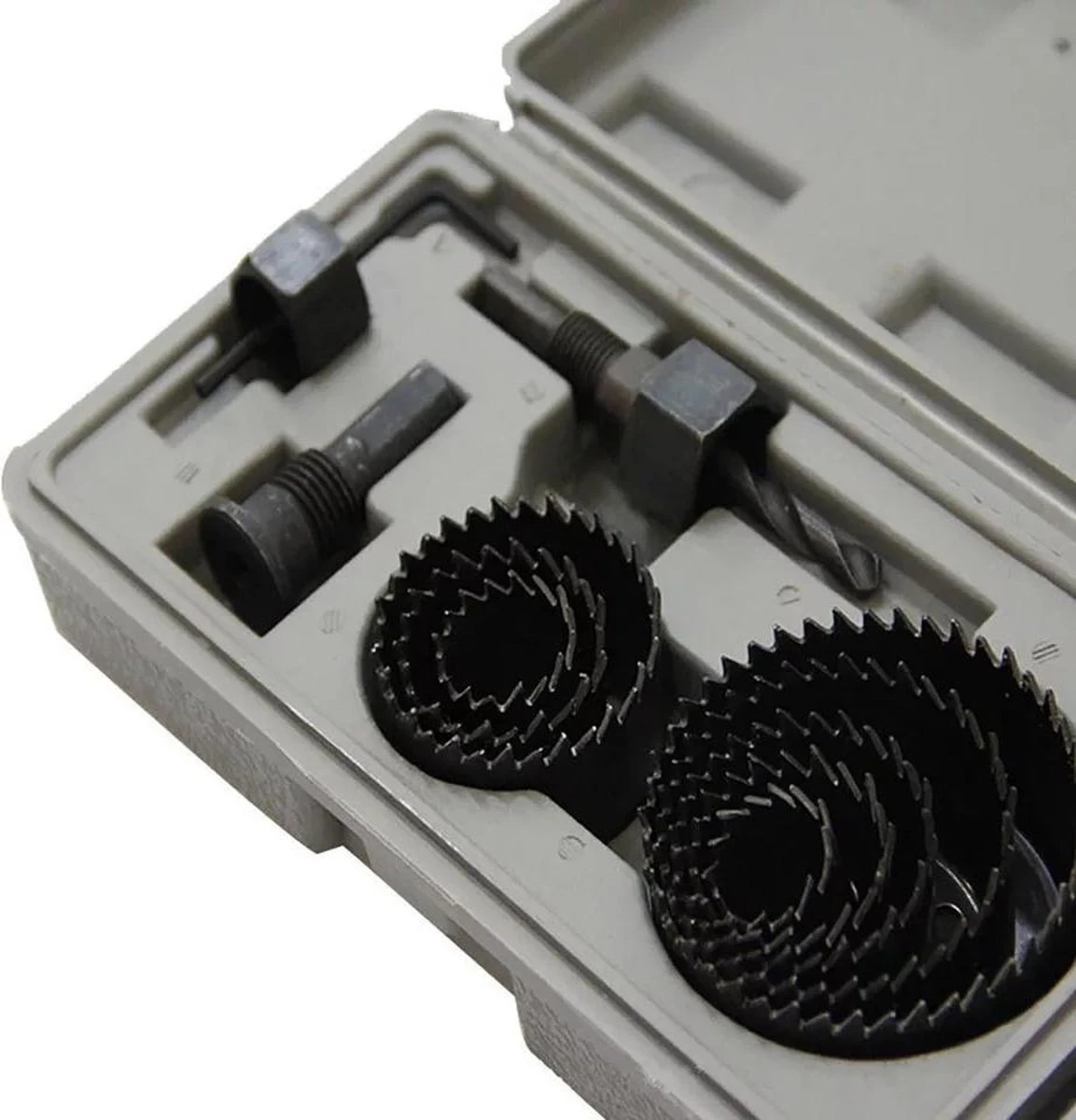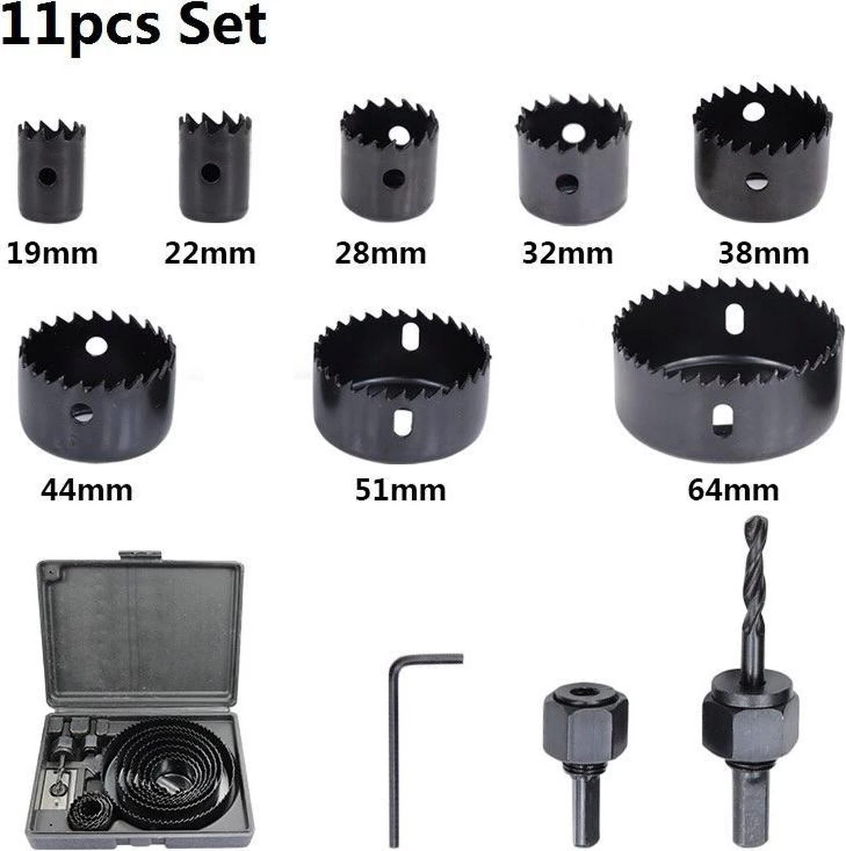 De serie wordt geleverd in een kunststof kist en omvat de volgende diameters: 19mm, 22mm, 28mm, 32mm, 38mm, 44mm, 51mm en 64 mm met een snedediepte van 28 mm.