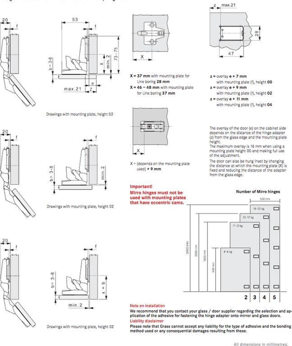 Grass glasdeurscharnier Mirro. Geleverd inclusief montageplaat en adapter om te verlijmen, voor spiegeldeuren met dikte 3 tot 8 mm.