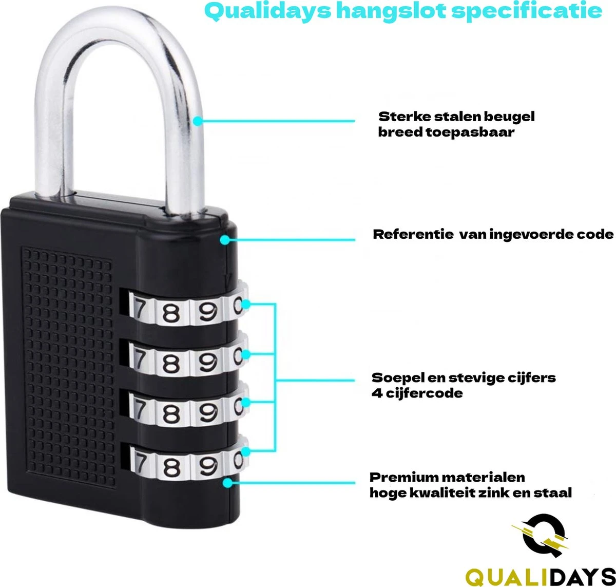 Uw spullen zijn met het hangslot tot wel 60% beter beschermt dan met de hangsloten van goedkopere merken. Wij maken gebruik van zink en staal, wat het openbreken van onze sloten erg lastig maakt. Wij geloven zelf 100% in ons product, daarom hebben wij bij Qualidays een niet tevreden binnen 30 dagen geld terug garantie!