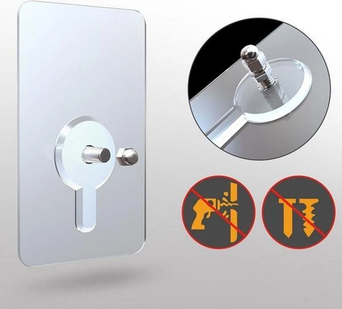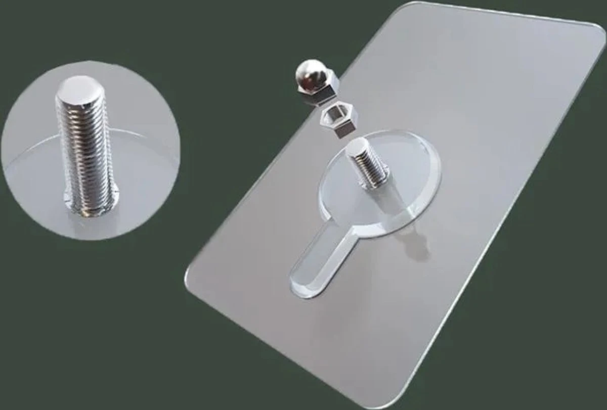 Dit product is een ophangsysteem bestaande uit zelfklevende spijkers/schroeven. Op elke schroef kan een meegeleverde bout geschroefd worden, om zo het op te hangen opject muurvast te zetten. Deze zelfklevende haakjes zijnt uitermate geschikt voor in de badkamer, in de keuken of in de woonkamer. Alvorens de haakjes opgehangen worden, dient de ondergrond goed ontvet en schoongemaakt te zijn. De haakjes hebben een maximaal draagvermogen van 5kg per stuk.