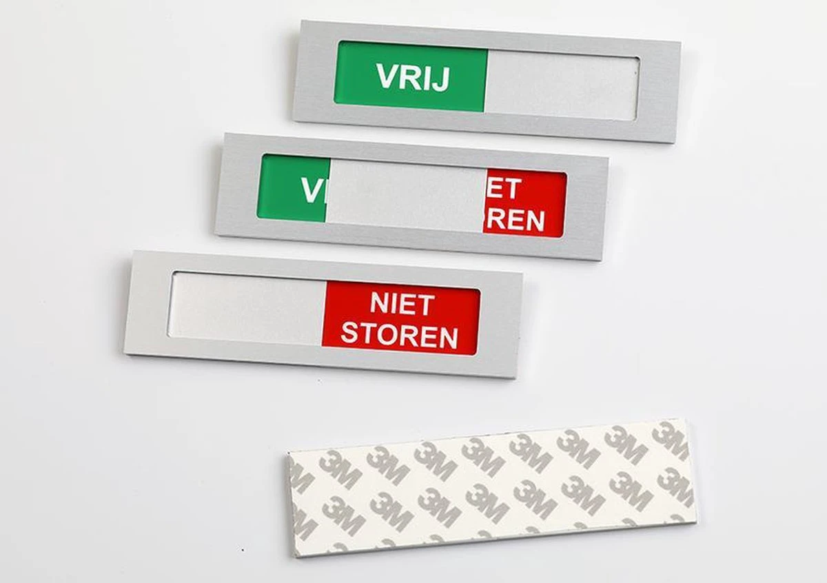 Vrij – Niet Storen schuifbord. Ook verkrijbaar in de maten 130 mm x 35 mm en 170 mm x 42 mm. Met dit schuifbordje geeft u duidelijk aan of de ruimte vrij of bezet is.