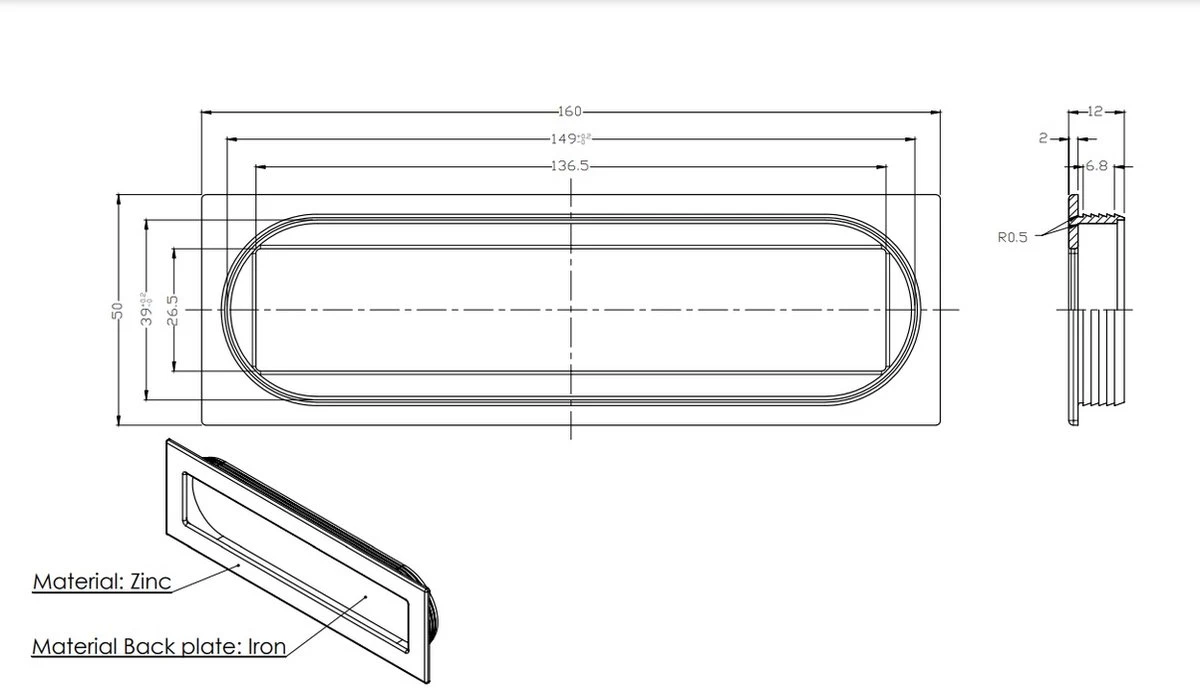 De afmeting van de meubelgreep is 160x50mm met een diepte van 10mm.