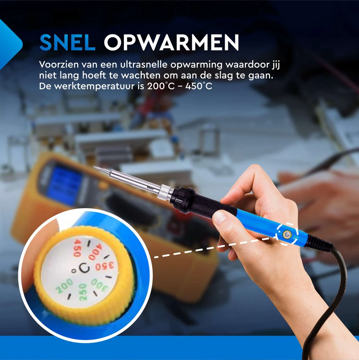Verschillende materialen behandel je op verschillende temperaturen. Onze soldeerbout heeft daarom een draaiknop waarmee je zelf gemakkelijk de juiste temperatuur instelt, variabel van 200 tot 450°C. Zo blijf jij de controle houden over je project.