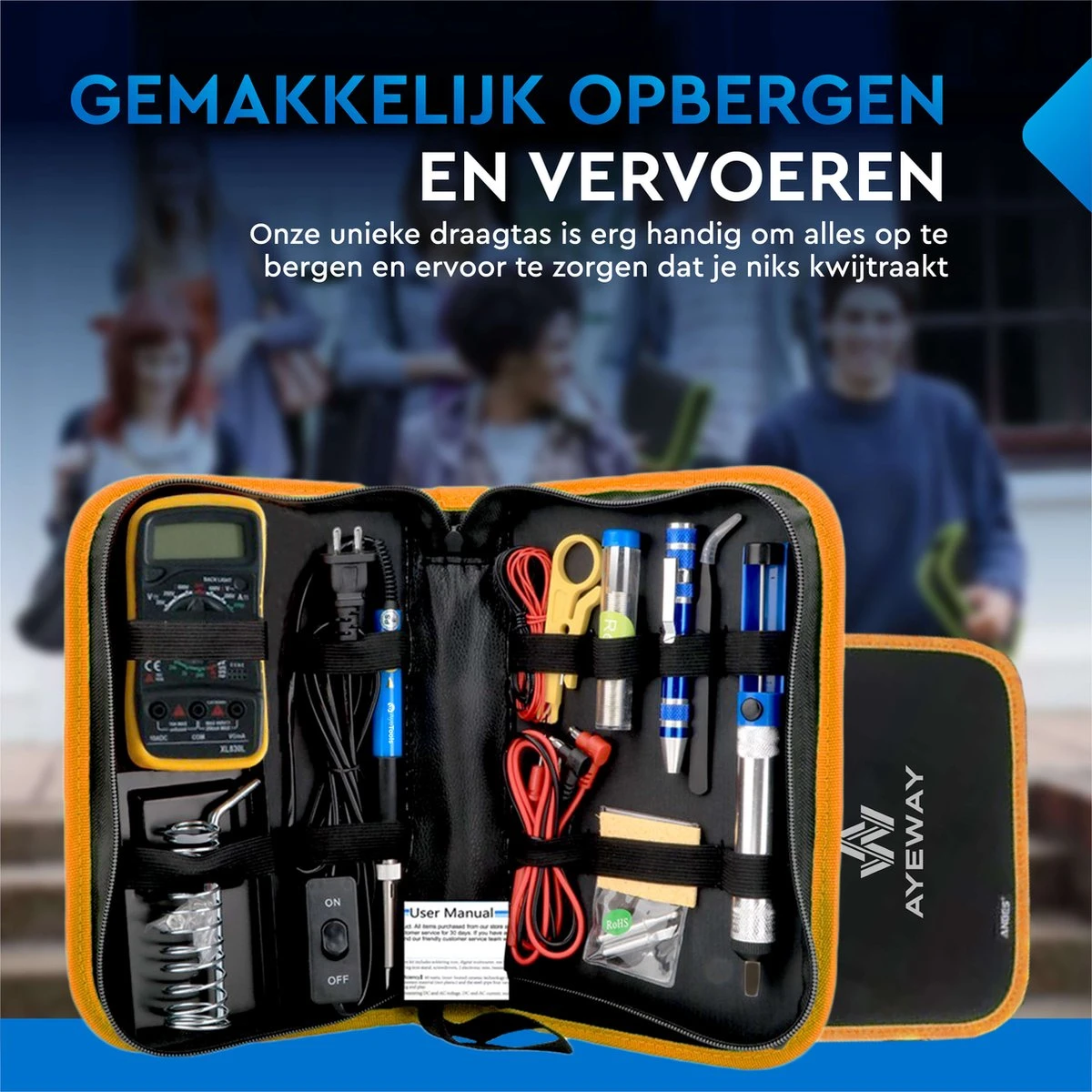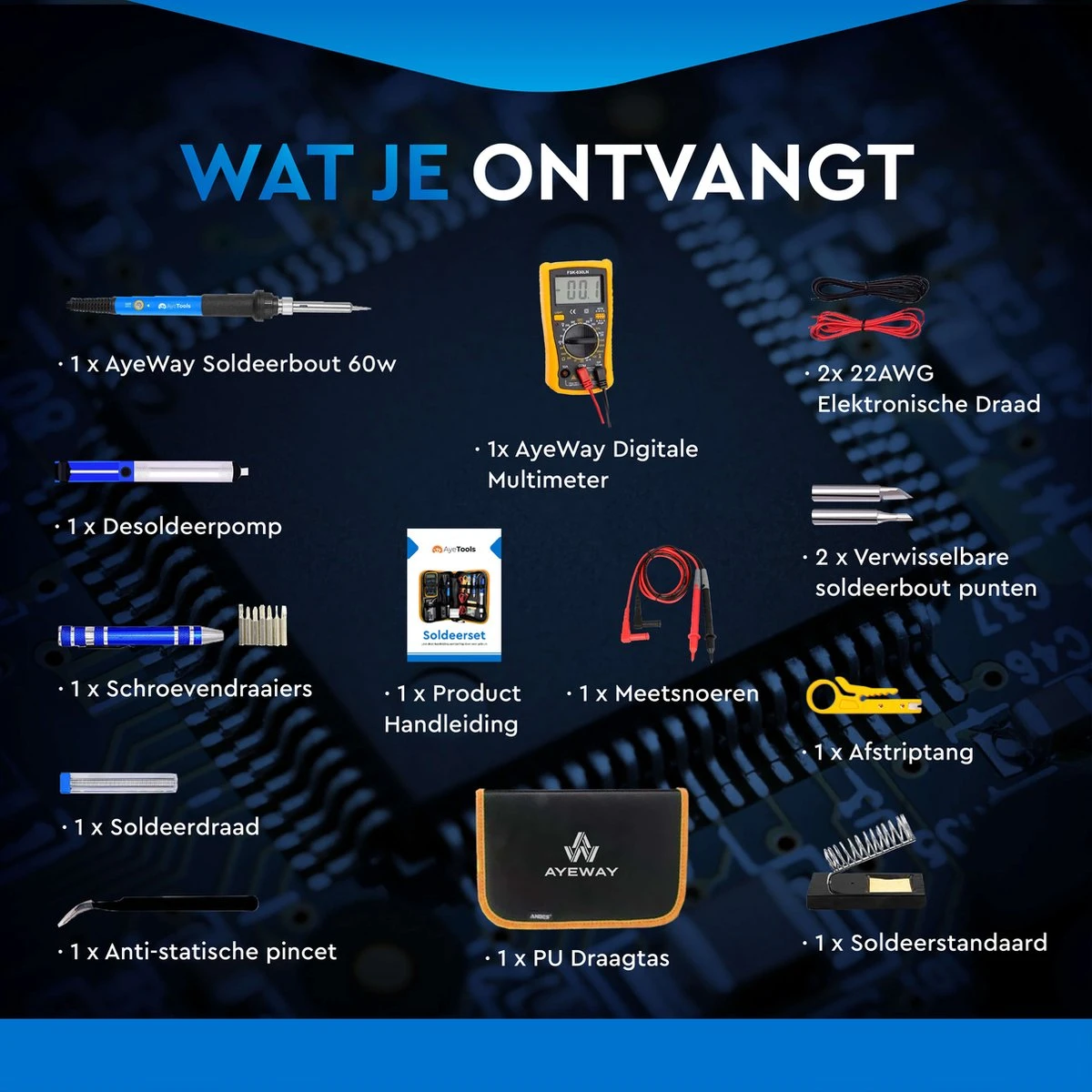 Repareer jij regelmatig printplaatjes, sieraden, of andere apparatuur? Met deze uitgebreide set blijf je eindeloos creëren. De 21-delige set bevat alle accessoires die je nodig hebt. Van pincet, tot elektrische draden, tot desoldeer pomp deze AyeWay soldeerboutset bevat alles wat jij nodig hebt.