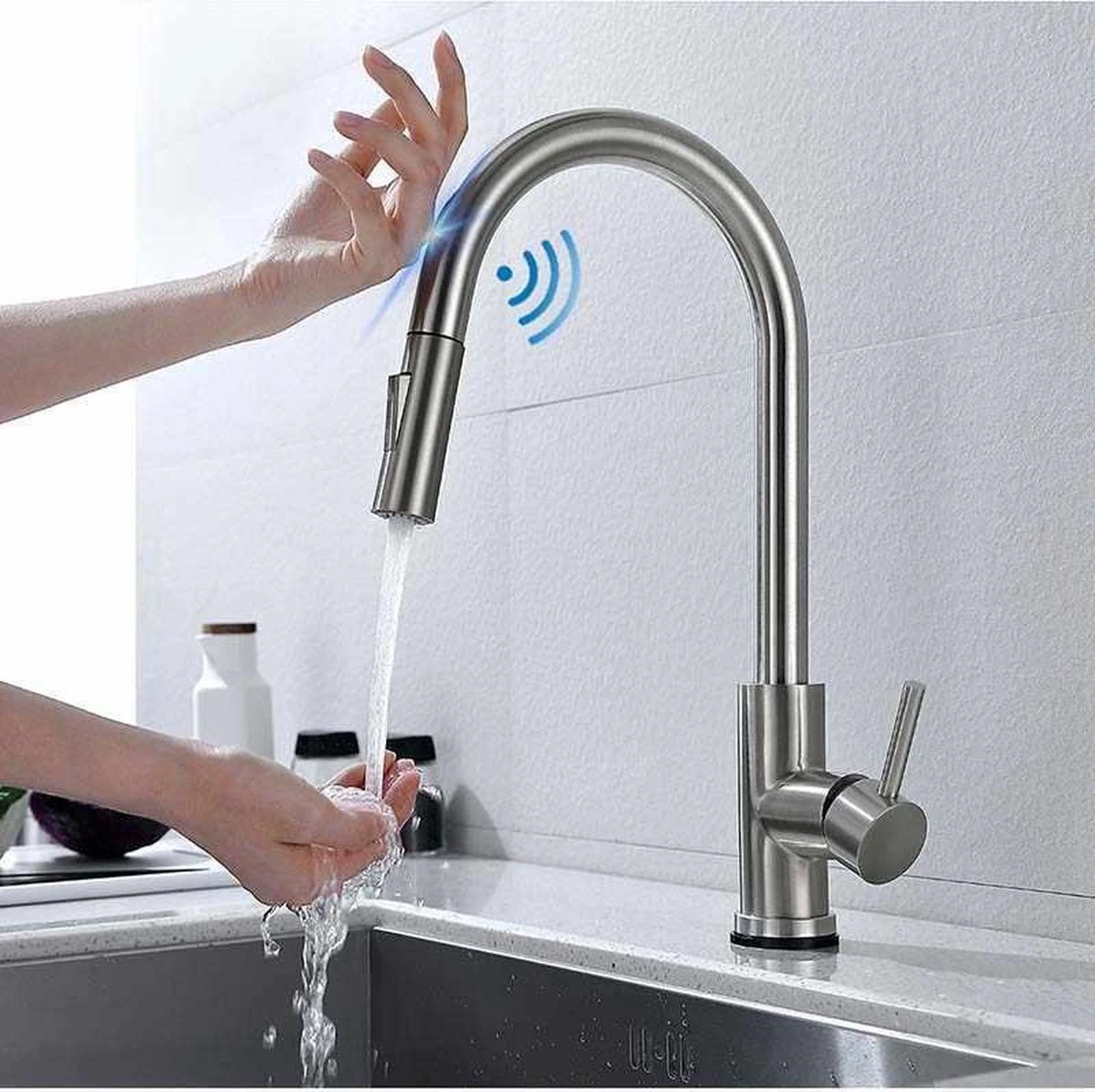 een simpele aanraking van de aanrecht kraan uitloop of lichaam start en de kraan stopt