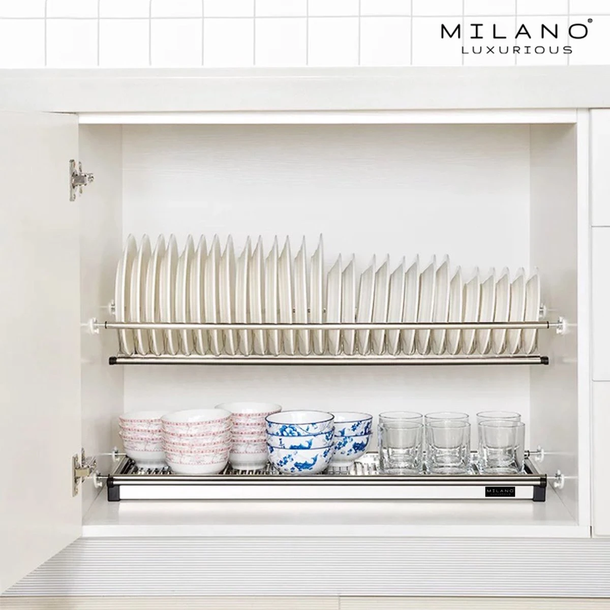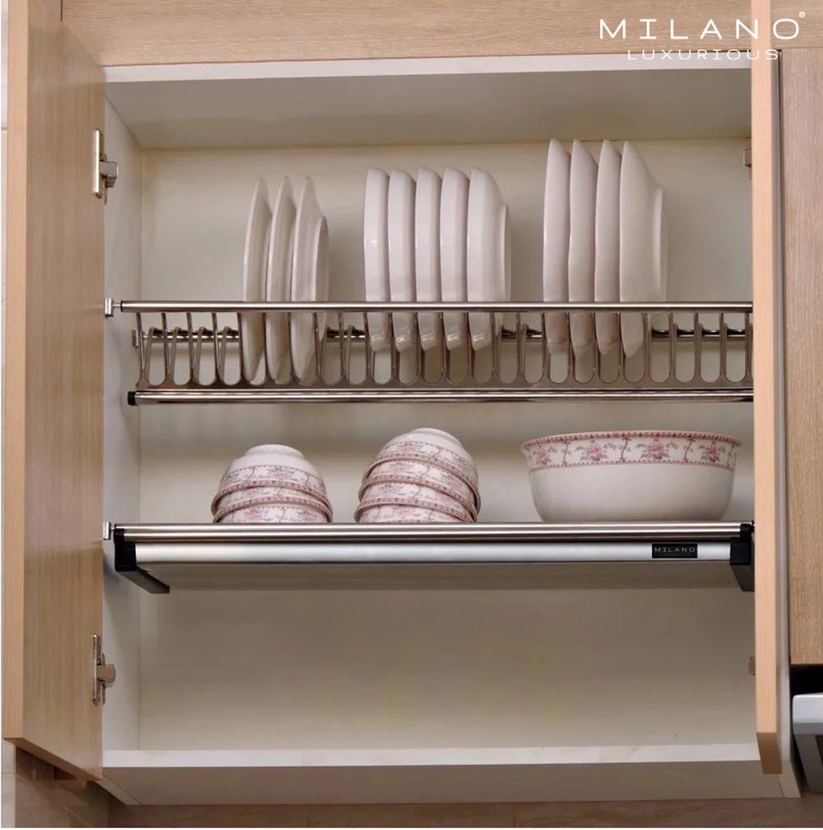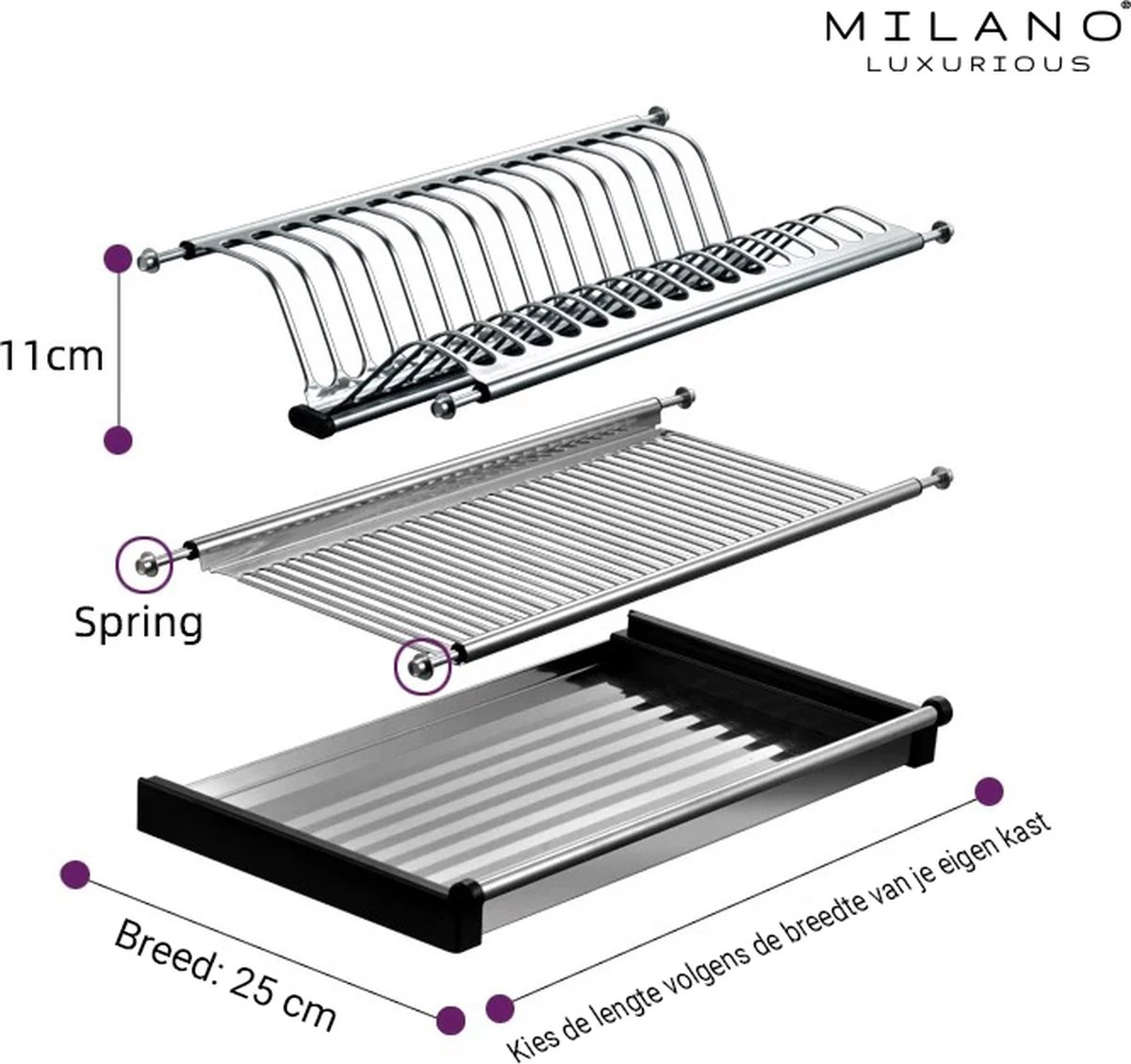 Omdat serviesgoed niet eenvoudig te vervangen is en het soms emotionele waarde heeft, wil je dit natuurlijk zo opbergen dat het niet beschadigd. Daarom hebben we bij Milano Luxurious ® dit praktische rek ontworpen. Het rek wordt geïnstalleerd in je keukenkast en biedt ruimte aan wel 24 borden op de bovenste laag. Op de onderste laag kun je schaaltjes, kopjes of ander serviesgoed veilig bewaren. Tevens is het onderste rek voorzien van een uitdruiprek, zodat je het rek kunt gebruiken om de afwas op te laten drogen.