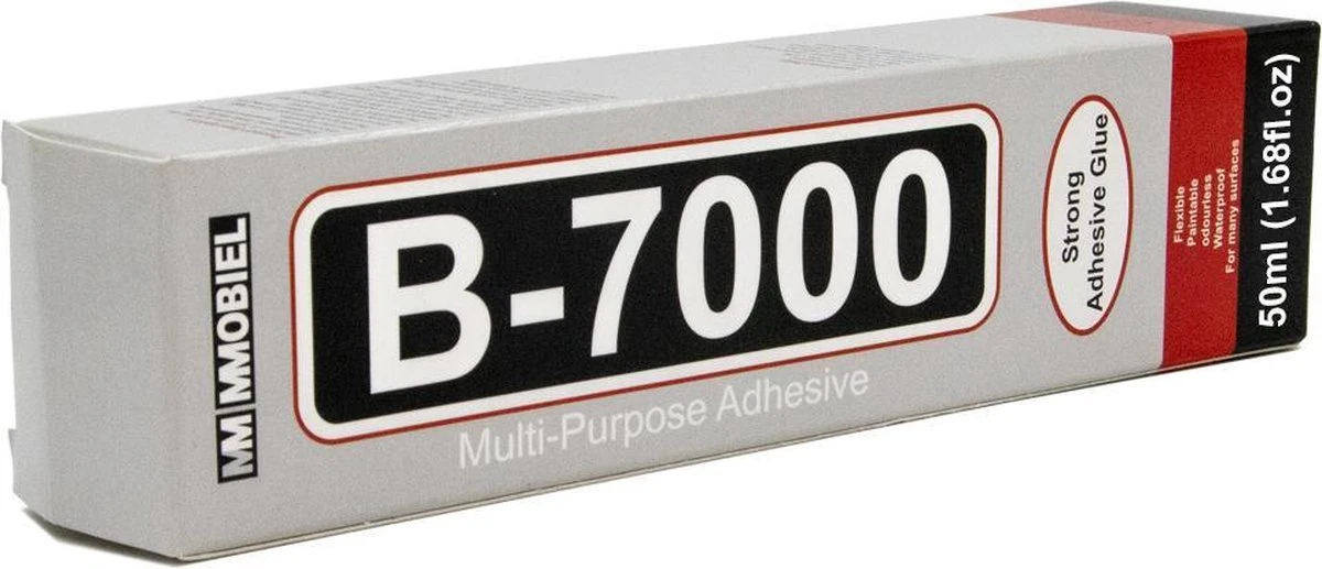 - De B7000 krachtige lijm overtreft in haar stevigheid en kan op veel meer verschillende ondergronden met hoge duurzaamheid plakken. Zelfs sterk poreuze en gladde oppervlaktes is voor deze lijm geen probleem!