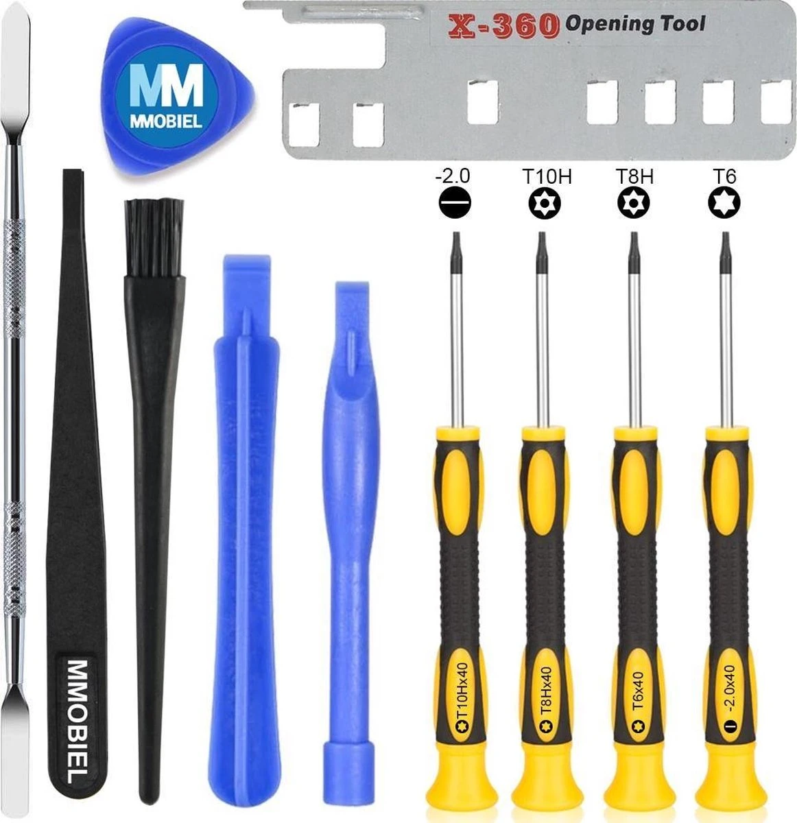- Ook inbegrepen in deze toolkit voor spelconsoles: 3 x schroevendraaiers Torx T6, T8H, T10H 1 x Platkopschroevendraaier 1 x speciale opening voor XBOX 1x plectrum 1x antistatische niet-geleidende polycarbonaat pincet, 1x reinigingsborstel.