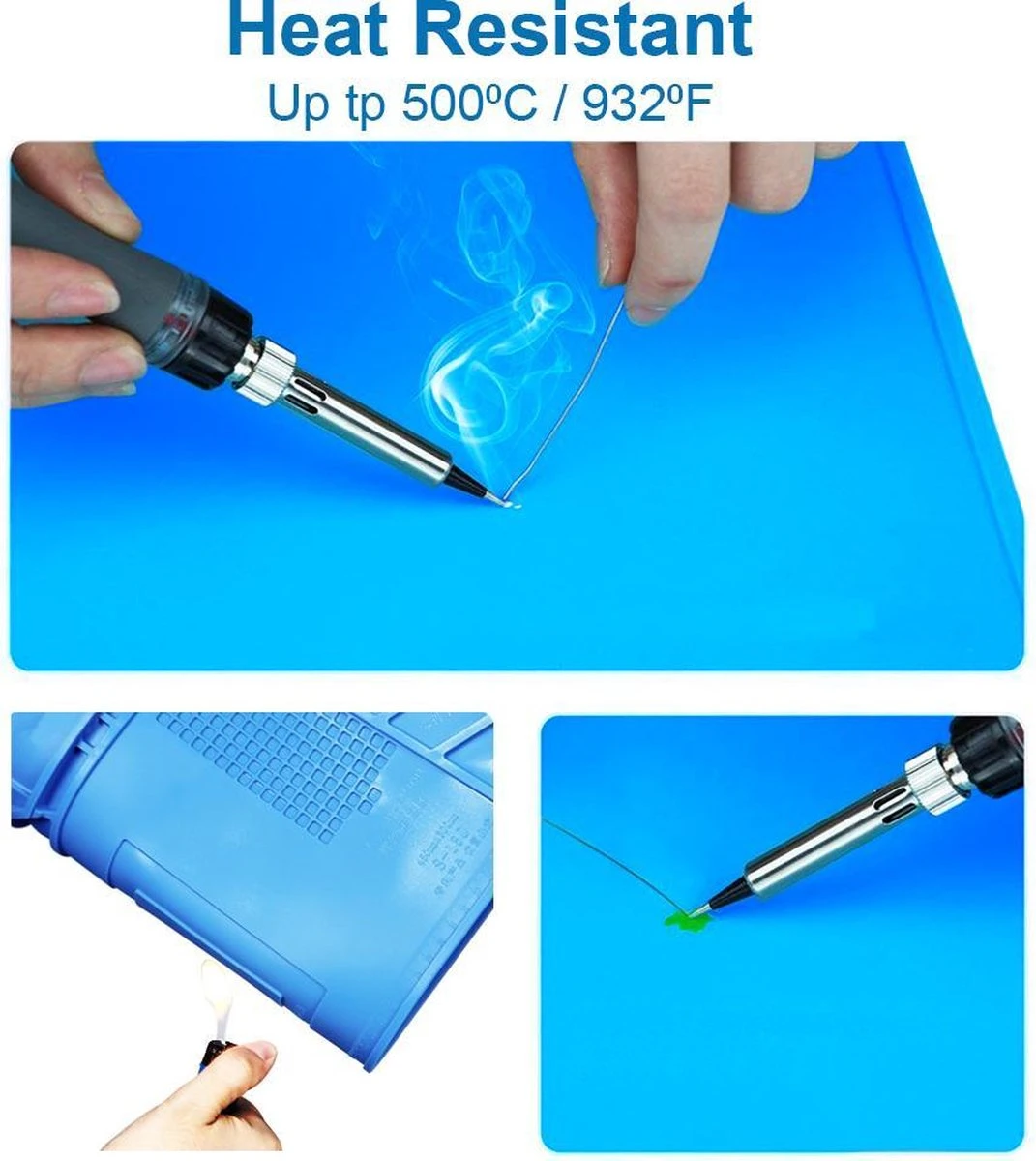 De hittebestendige mat is gemaakt van verdikt silicagel waardoor deze eenvoudig te reinigen is van lijm/soldeer resten.