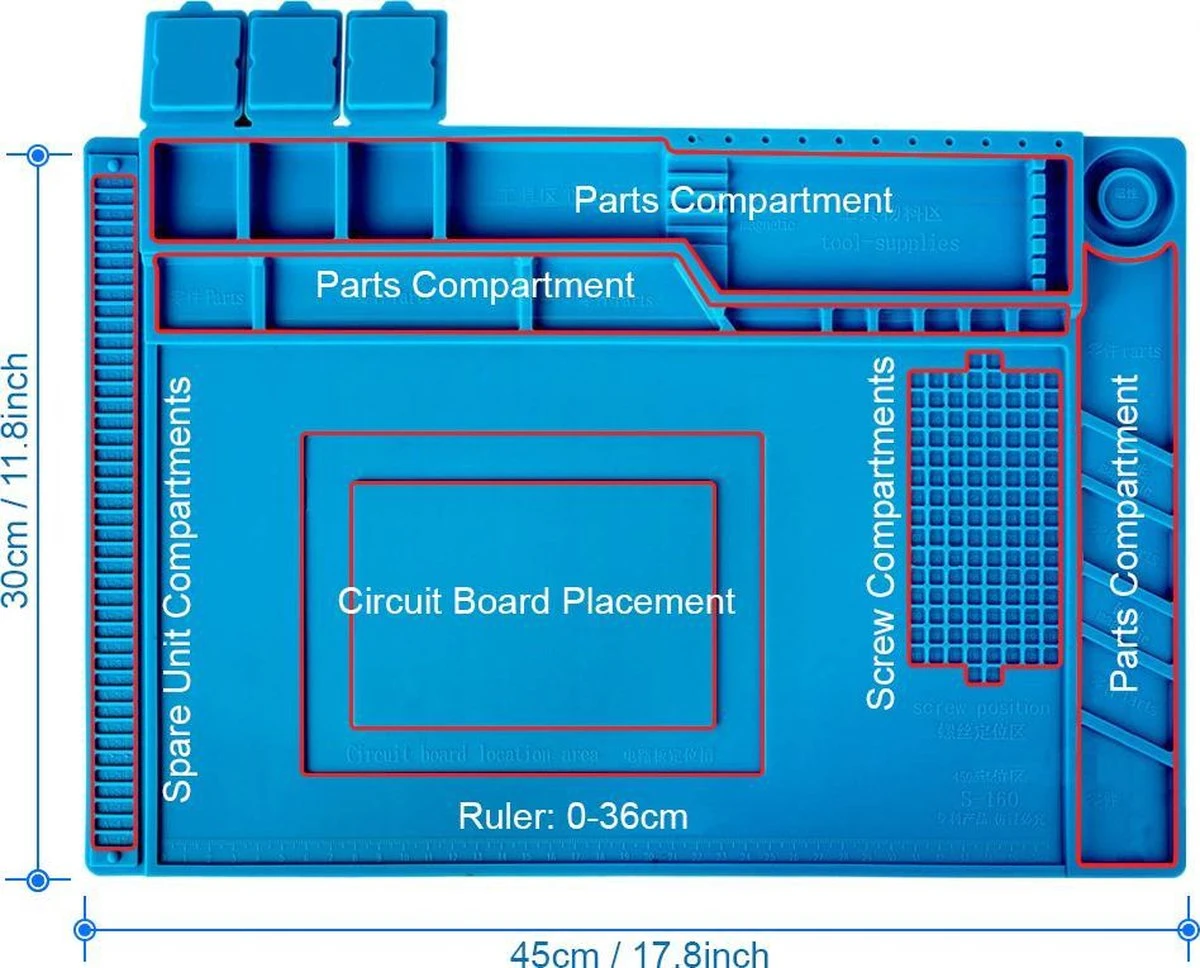 De MMOBIEL Antistatische soldeermat met diverse gereedschap houders is hittebestendig (500°C) en bevat magnetische zones waardoor de soldeermat multifunctioneel is en ideaal voor soldeer-en reparatiewerkzaamheden.