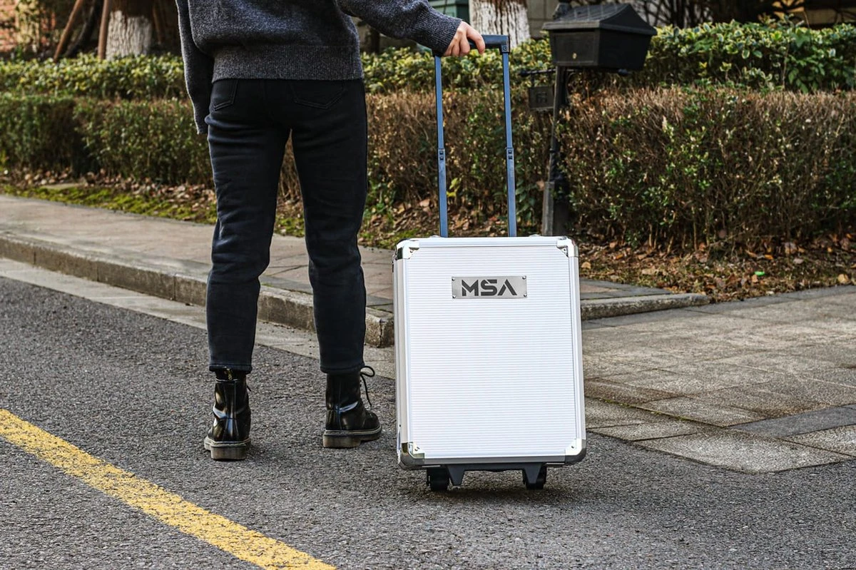 - De afsluitbare koffer is voorzien van wieltjes en uitschuifbaar handvat