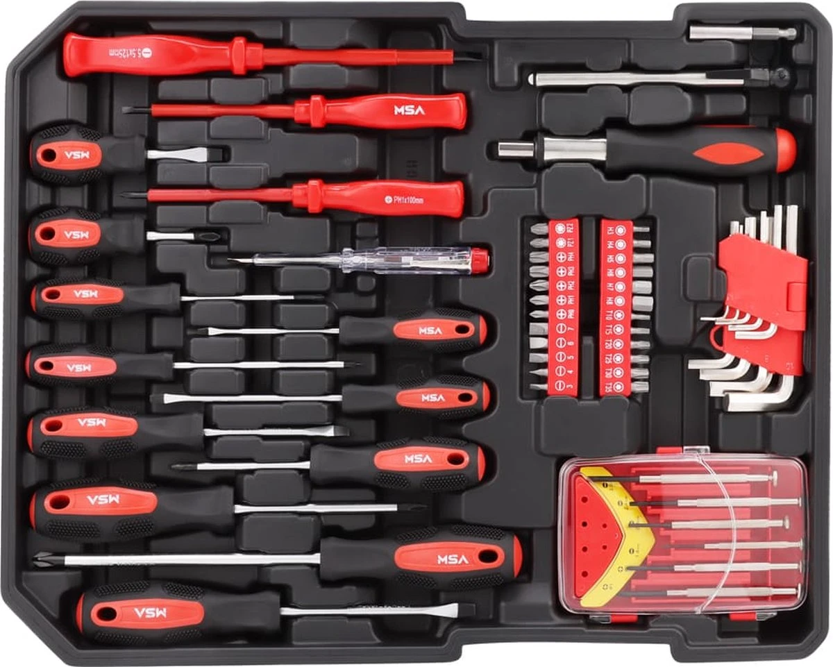Met deze enorme gereedschapstrolley van MSA heb je altijd alle belangrijke gereedschappen bij de hand. Maar liefst 610 stukken gereedschap staan tot je beschikking. Al het gereedschap ligt overzichtelijk opgeborgen in 4 inlays. Maak snel gebruik van deze supervoordelige aanbieding!