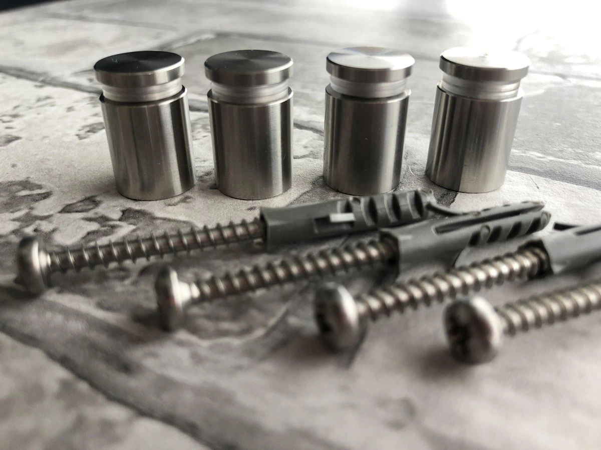 De rvs afstandhouders die u erbij geleverd krijgt hebben een linkse draad. Waardoor u ze losdraait door met de klok mee te draaien. Via onderstaande link kunt u stap voor stap zien hoe u het naambordje kunt ophangen.