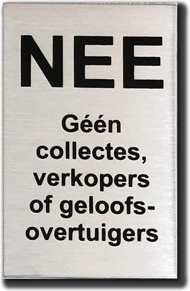 Geen colportage of verkopers? Gebruik dan onze bordjes. Ook hebben wij de bekende JA NEE en NEE NEE stickers tegen ongewenste reclame in ons Bol assortiment, maar dan van aluminium. Kleurecht en krasvast. NEE Géén collectes, verkopers of geloofsovertuigers