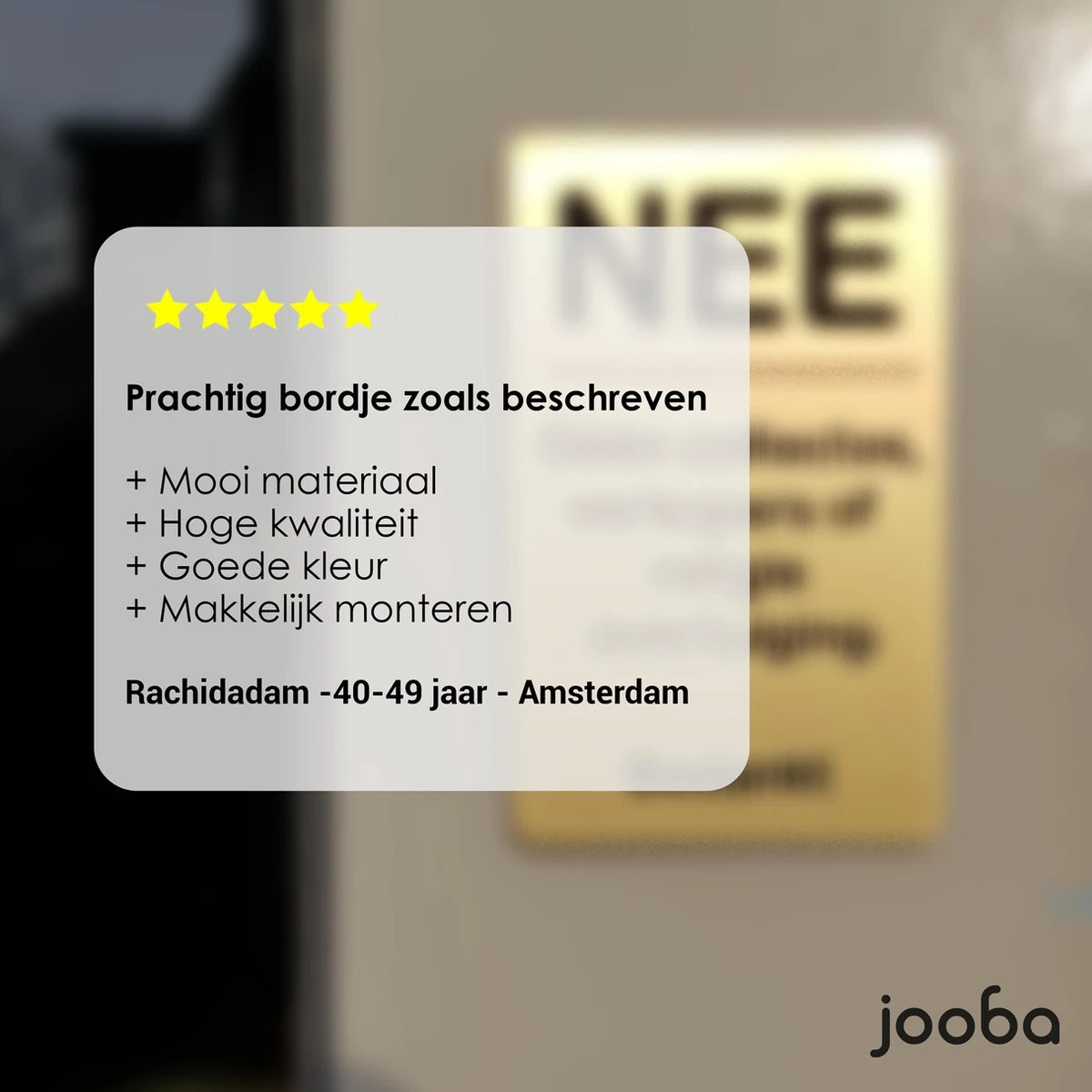 Vaak hebben dit soort bordjes een onvriendelijke uitstraling die de boodschap niet altijd ten goede komen. Door middel van de vorm en lettertype wordt met dit deurbordje op een nette en vriendelijke wijze duidelijk gemaakt dat ongewenst bezoek aan de deur niet gewenst is.
