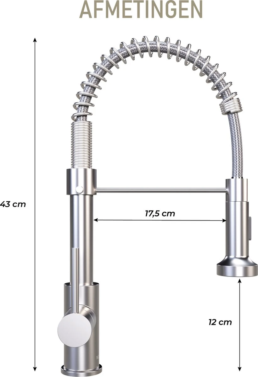 - Eyecatcher – met het luxueuze design, hoge vorm van 43 centimeter en strakke kleur is deze keukenmengkraan een echte eyecatcher in elke keuken. Voor de precieze afmeting verwijzen we je door naar de foto.