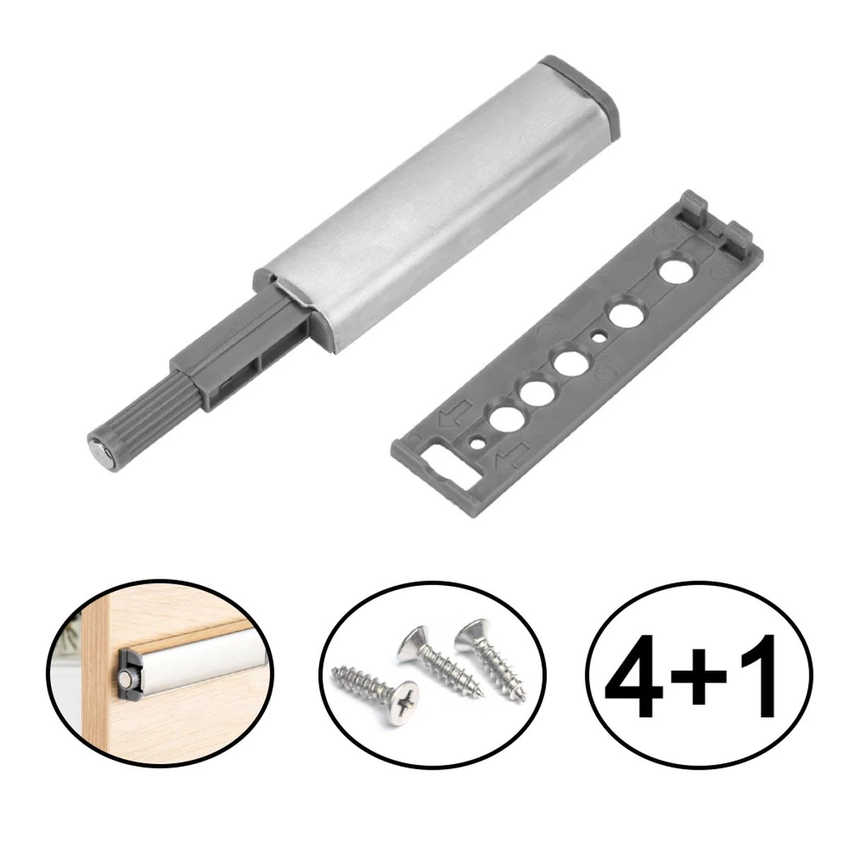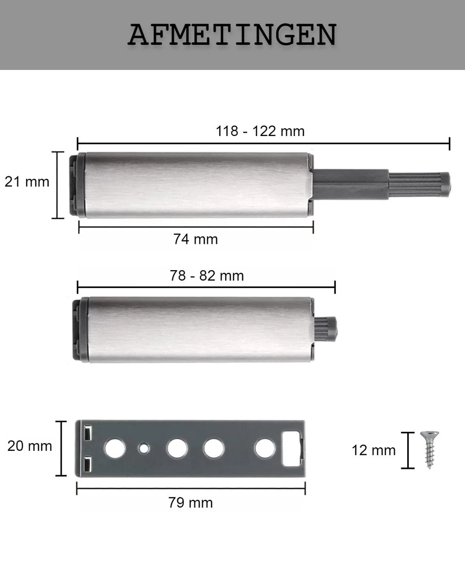De druksnappers zijn gemakkelijk te bevestigen in bestaande kastjes, zoals beschreven is in de handleiding. Deze set wordt geleverd inclusief de bijbehorende metalen plaatjes voor op de deuren inclusief schroef en plug. Door de druksnappers op de plaats in de kast te bevestigen waar op de deur gedrukt zal worden zal de druksnapper het best werken. De magnetische plaatjes moeten op de plaats aan de binnenkant van de deur worden bevestigd waar de top van de druksnapper contact heeft met de deur. De top van de druksnapper kan bij het niet volledig sluiten of het niet opengaan wanneer er op de deur gedrukt wordt verkort of verlengd worden. Dit kan worden gedaan door aan de top te draaien, met een speling van 4 mm.