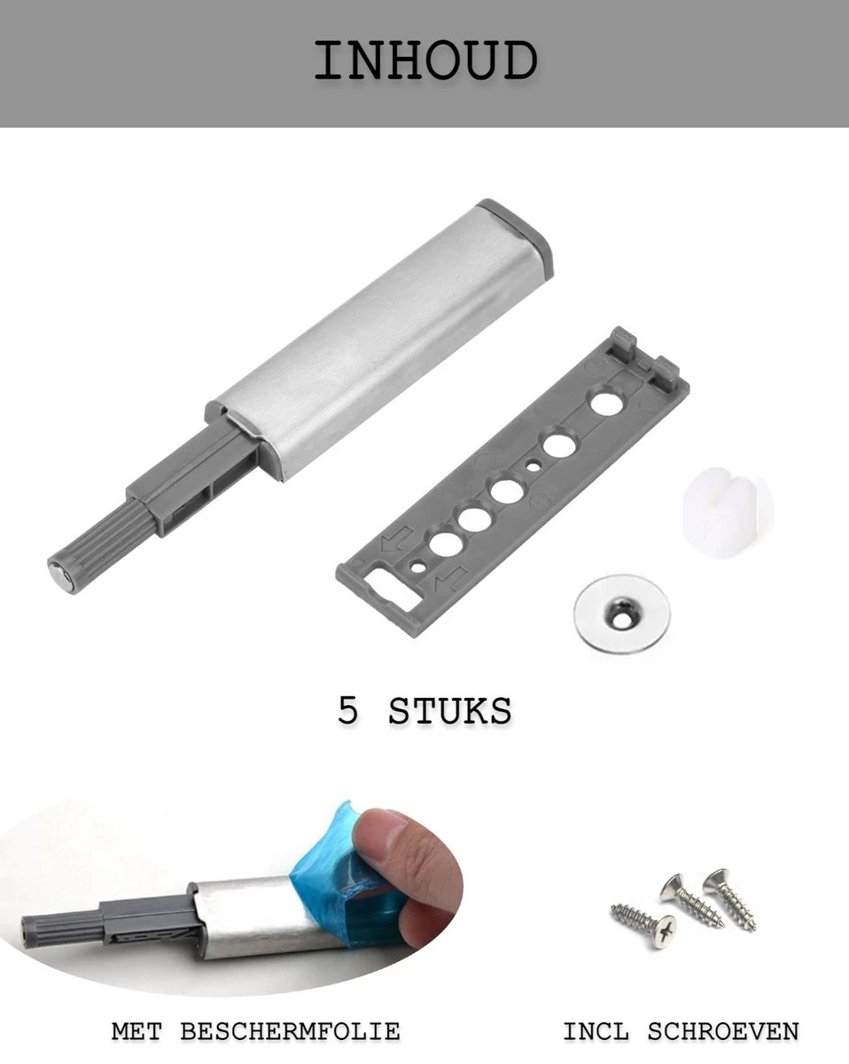 Het openen van kastdeuren en lades kan gemakkelijk worden gedaan door gebruik te maken van de druksnappers. De druksnappers voeren hun werking al uit wanneer er op de deur gedrukt wordt. Door de magnetische plaatjes aan de binnenkant van de deur waar de top van de druksnapper contact heeft te plaatsen, zal de magnetische werking de deur strak dicht houden. Op deze manier zal de deur niet zomaar open gaan.