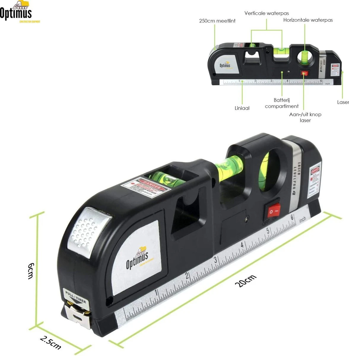 Rechte lijnen meten was nog nooit zo makkelijk met de Optimus Laserwaterpas! Bestel vandaag nog de professionele 3 punts-Waterpas met accurate laser en meetlint van Optimus! Het nieuwste design met 2,5M lange meetlint, 10M laser meetbereik en een professionele nauwkeurigheid. De Laserwaterpas is roestvrij, compact, makkelijk te dragen en bovendien razend populair in Nederland en België.